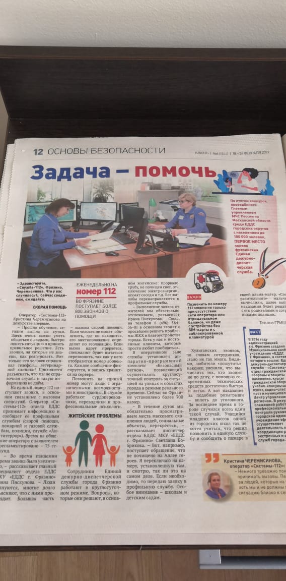 ![]() Вышел очередной выпуск газеты "Ключъ" №6 (1544) 18-24 февраля 2021 г.. В разделе "Основы безопасности" статья "Задача - помочь", где вы можете познакомиться с работой МКУ "ЕДДС г. Фрязино" и "Системой-112". ______________________________________________________________________________________________________________________