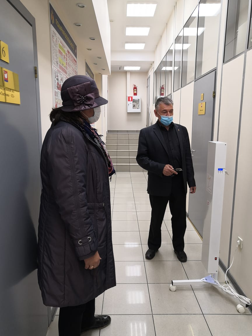 Контроль соблюдения санитарных норм и требований в МКУ "ЕДДС г.Фрязино".По поручению Губернатора МО продолжается контроль за соблюдением масочного режима. 22.10.2020 первый заместитель главы администрации городского округа Фрязино Т.К. Бурцева посетила МКУ «ЕДДС г. Фрязино» с целью контроля соблюдения санитарных требований и норм в Учреждении. Всем сотрудникам и посетителям ЕДДС проводятся измерение температуры и дезинфекция рук. В Учреждении установлен рециркулятор, который может эксплуатироваться в присутствии людей.