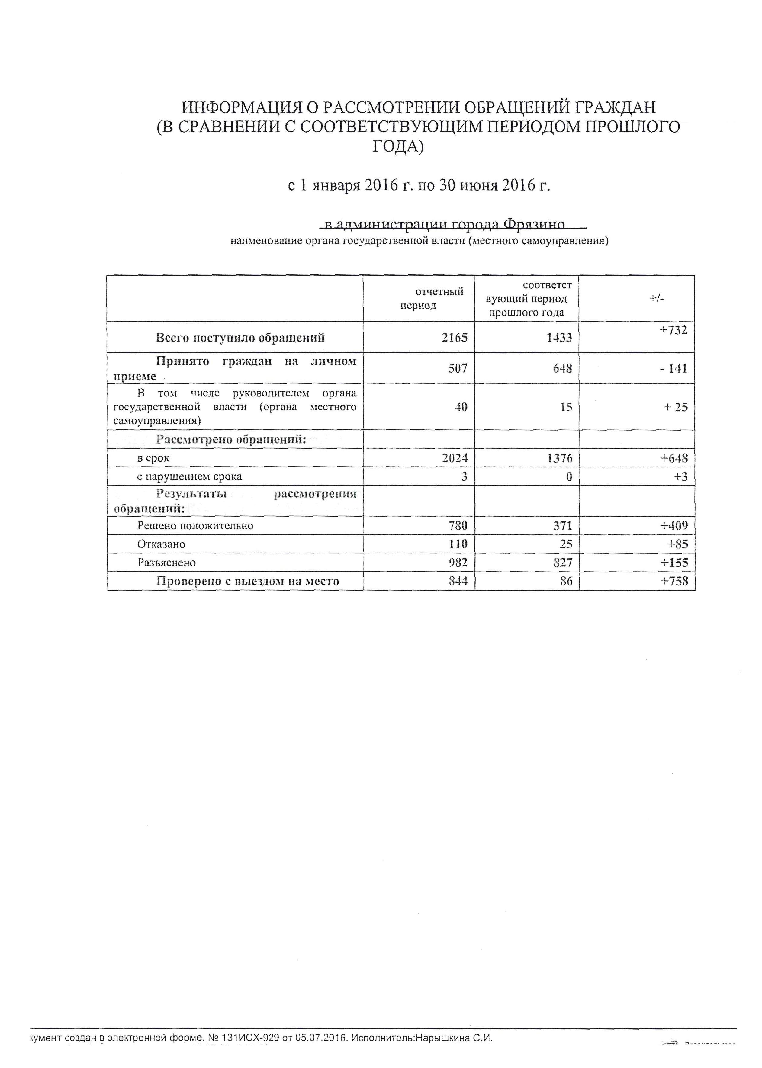 Отчет по работе с обращениями граждан за первое полугодие 2016 год