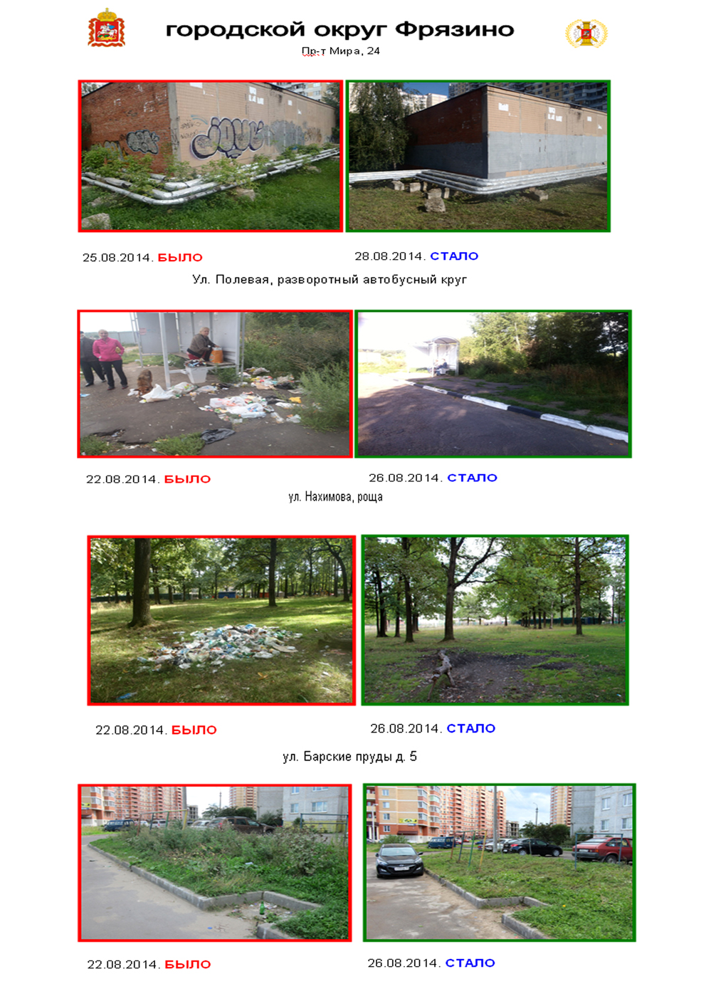 В результате проделанной работы в порядок приведен 1081 объект. В их число входят 221 торговый объект, более 190 площадей, улиц и полос отвода автомобильных дорог, свыше 200 дворов, почти 100 фасадов нежилых зданий и строений, около 50 мест проведения земляных и ремонтных работ и 47 строительных площадок, 114 мест отдыха и общественного пользования, более 30 объектов наземных линий коммуникаций, свыше 70 территорий предприятий промышленности, порядка 40 подъездных путей и 13 иных объектов, так же находящихся в сфере контроля Госадмтехнадзора Московской области.