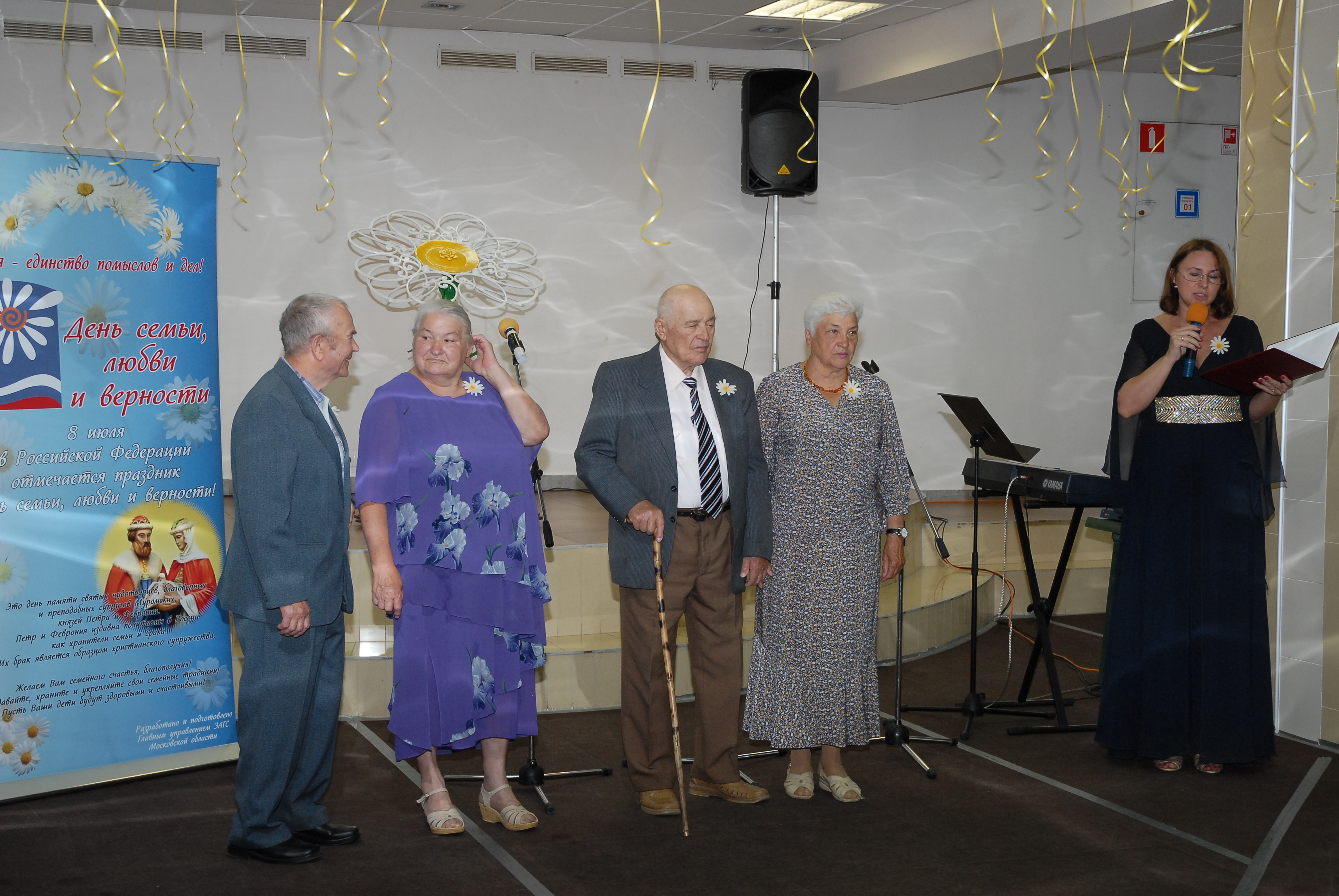08 июля 2015 года во дворце культуры «Исток» города Фрязино прошло трогательное мероприятие, посвящённое дню семьи, любви и верности, в котором приняли участие 15 пар юбиляров семейной жизни, Глава города Фрязино-В.В.Ухалкин, руководитель администрации города Фрязино-И.М.Сергеев, представители духовенства. Произвели впечатление на присутствующих краткие истории жизни каждой из юбилейных пар-ведь всем им есть чем гордиться! Приятно было видеть людей с приветливой улыбкой, ласковым и добрым взглядом. Именно такие люди создают крепкие и счастливые семьи, в которых вырастают замечательные дети. Ведь главные секреты семейного счастья-это умение понять и услышать другу друга, терпение и любовь.