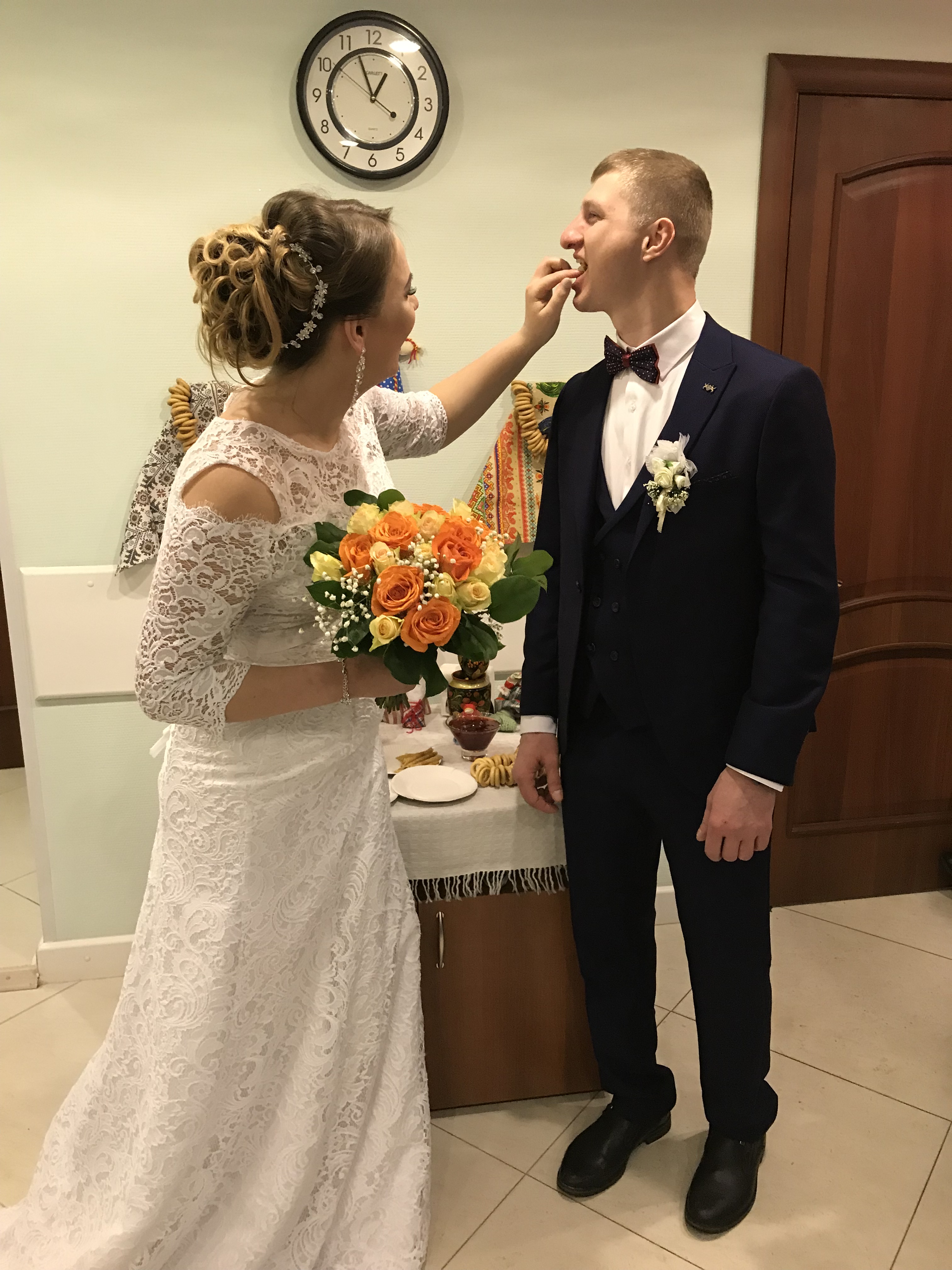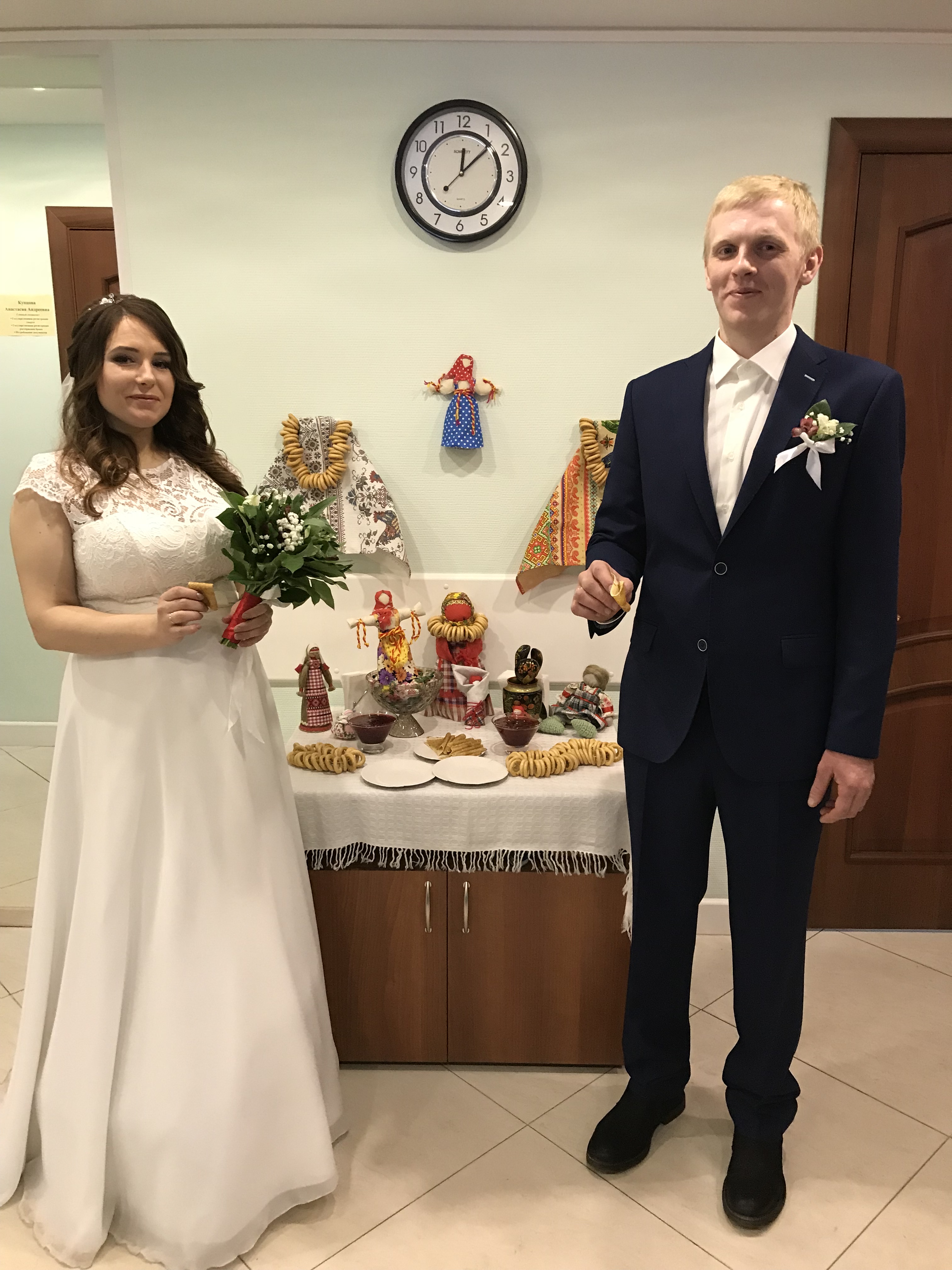 Масленица – для нас, это, прежде всего, ставшие традиционными, проводы зимы, озаренные радостным ожиданием приближающегося тепла и весеннего обновления природы. Масленичная суббота называется «золовкиными посиделками». Этот день считался всегда семейным, новобрачная невестка должна была одаривать золовок подарками. В этот субботний день молодые невестки принимали у себя родных, кормили их блинами и поили чаем. В последнюю субботу уходящей зимы в отделе ЗАГС г. Фрязино зарегистрировали свой брак 5 пар молодоженов. Сотрудники отдела ЗАГС подготовили в холле обряд чествования молодоженов - угощение русскими блинами и желали молодым парам, чтобы их семейная жизнь шла «как по маслу», а гостям, чтобы мир и добро было в каждой семье. Украшенные в русском стиле столы с блинами, баранками, сладостями придали празднику неповторимый колорит.