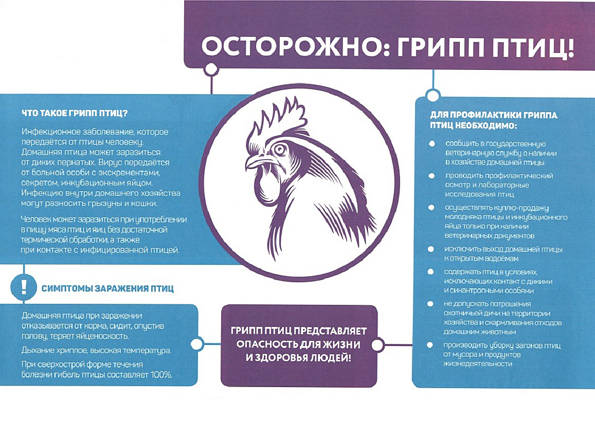 С приближением весеннего периода активируются так называемые «собачьи свадьбы» - это брачный период у собак. В этот период собаки становятся более агрессивными. Чтобы избежать нападения собак необходимо соблюдать следующие правила: - не делайте резких движений и не приближайтесь к собаке; - относитесь к животным с уважением и не прикасайтесь к ним в отсутствие хозяина; - не трогайте животных во время сна или еды; - не кормите чужих собак; - не приближайтесь к собаке, находящейся на привязи. В случае обнаружения собак без владельцев, проявляющих немотивированную агрессию на территории городского округа Фрязино, просим сообщить по телефону: 8-800-550-65-22 (круглосуточно) или 8-496-566-90-60 (доб. 250, 251) - понедельник - пятница с 09:00 до 18:15. ВНИМАНИЕ! Высокопатогенный грипп птиц! В настоящее время наблюдается распространение гриппа птиц, которое представляет опасность для жизни и здоровья людей! Что такое грипп птиц? Это опасное инфекционное заболевание птиц, характеризующееся поражением кровеносной и центральной нервной систем, органов дыхания, пищеварения, выделения и яйцеобразования. Отмечается высокая летальность. В целях предотвращения возникновения и распространения ВГП физическим и юридическим лицам, индивидуальным предпринимателям, являющимся собственниками, необходимо своевременно осуществлять профилактические, диагностические, ограничительные и иные мероприятия.