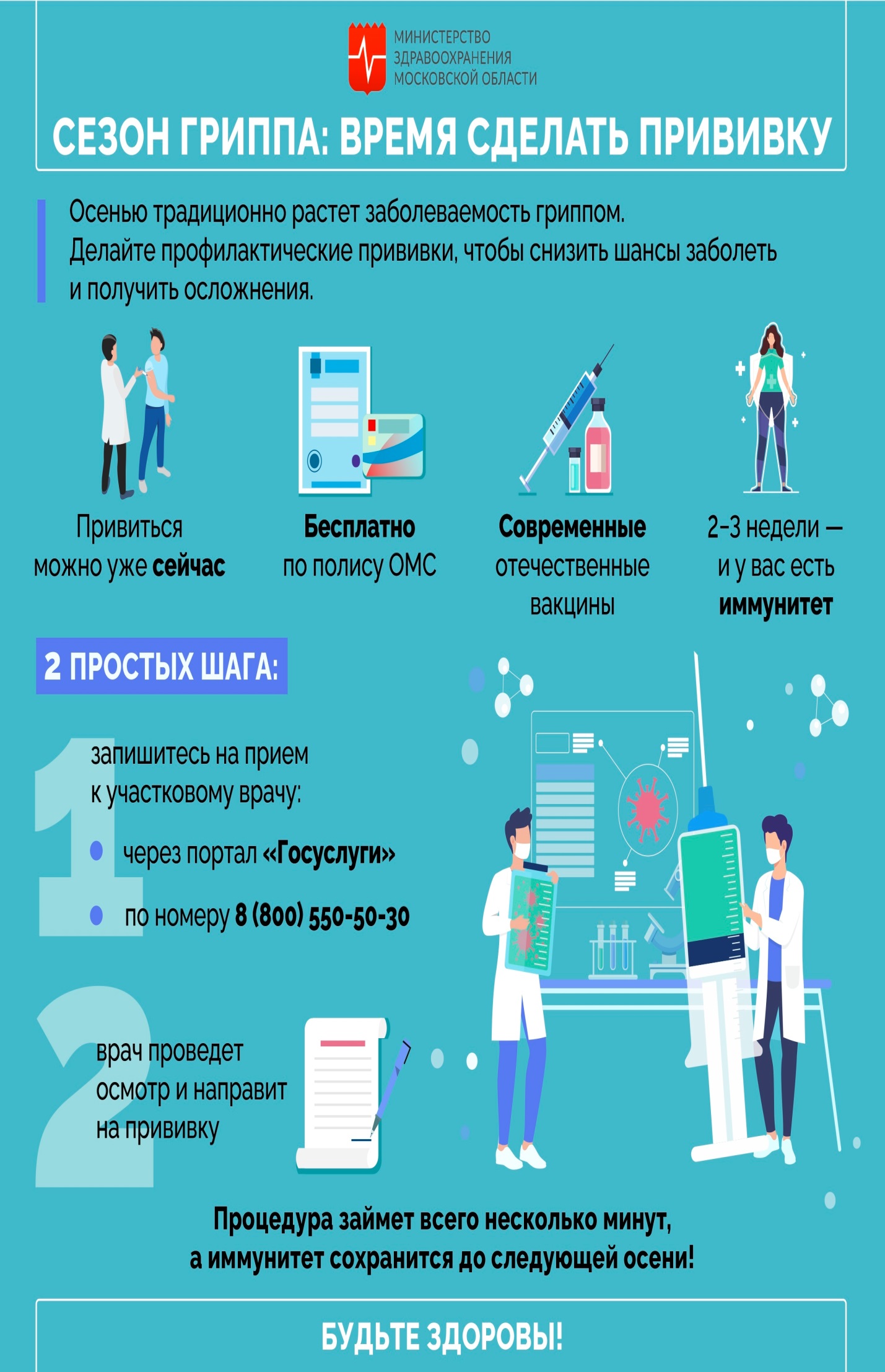 Во исполнение постановления Главного государственного санитарного врача Российской Федерации от 13.07.2020 № 20 «О мероприятиях по профилактике гриппа и острых респираторных вирусных инфекций, в том числе новой коронавирусной инфекции (COVID-2019) в эпидемическом сезоне 2020-2021 годов», а также усиления мероприятий по предупреждению заболевания граждан гриппом и острыми респираторными вирусными инфекциями, Министерством здравоохранения Московской области утвержден план вакцинации против гриппа населения Московской области в 2020 году.