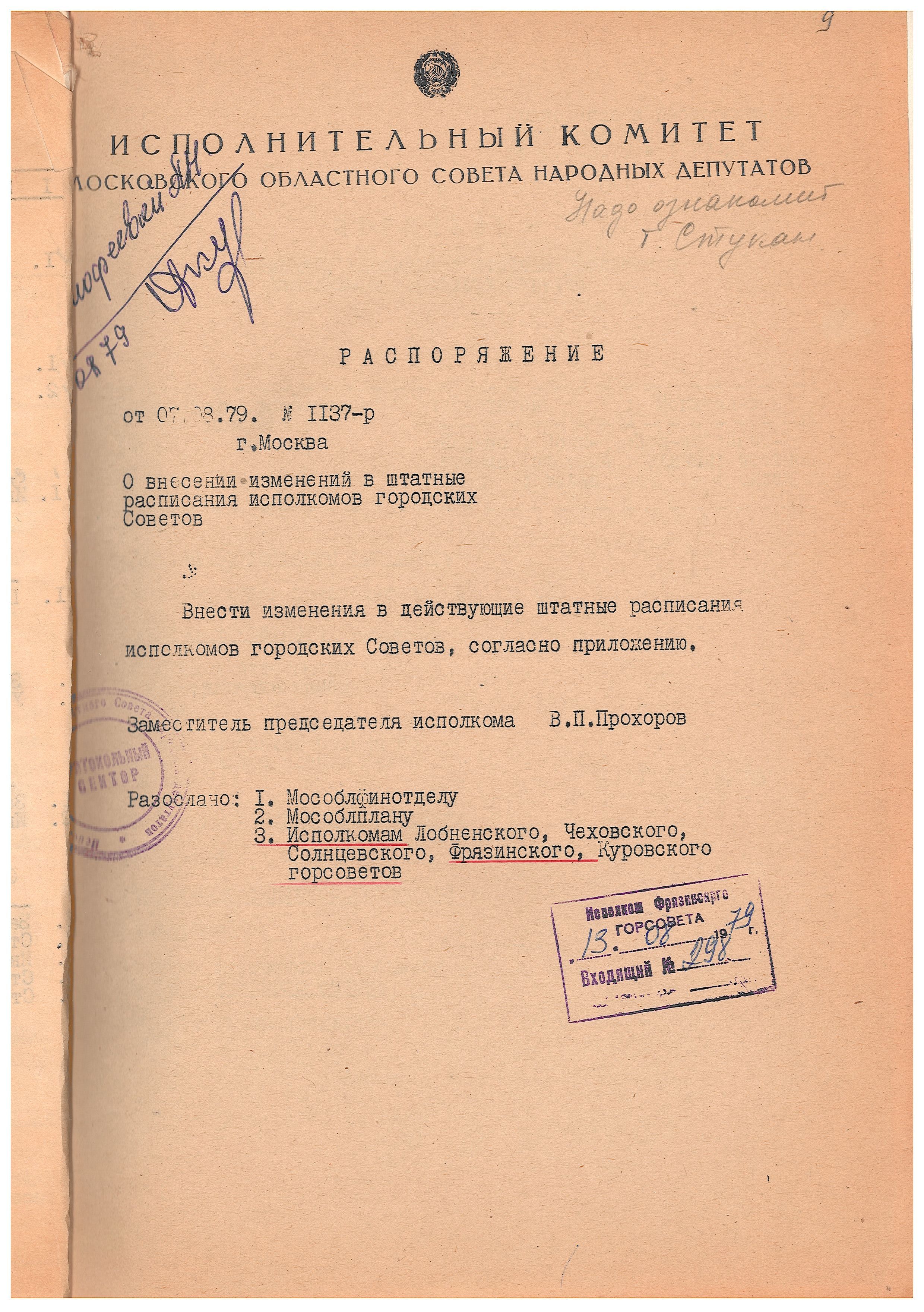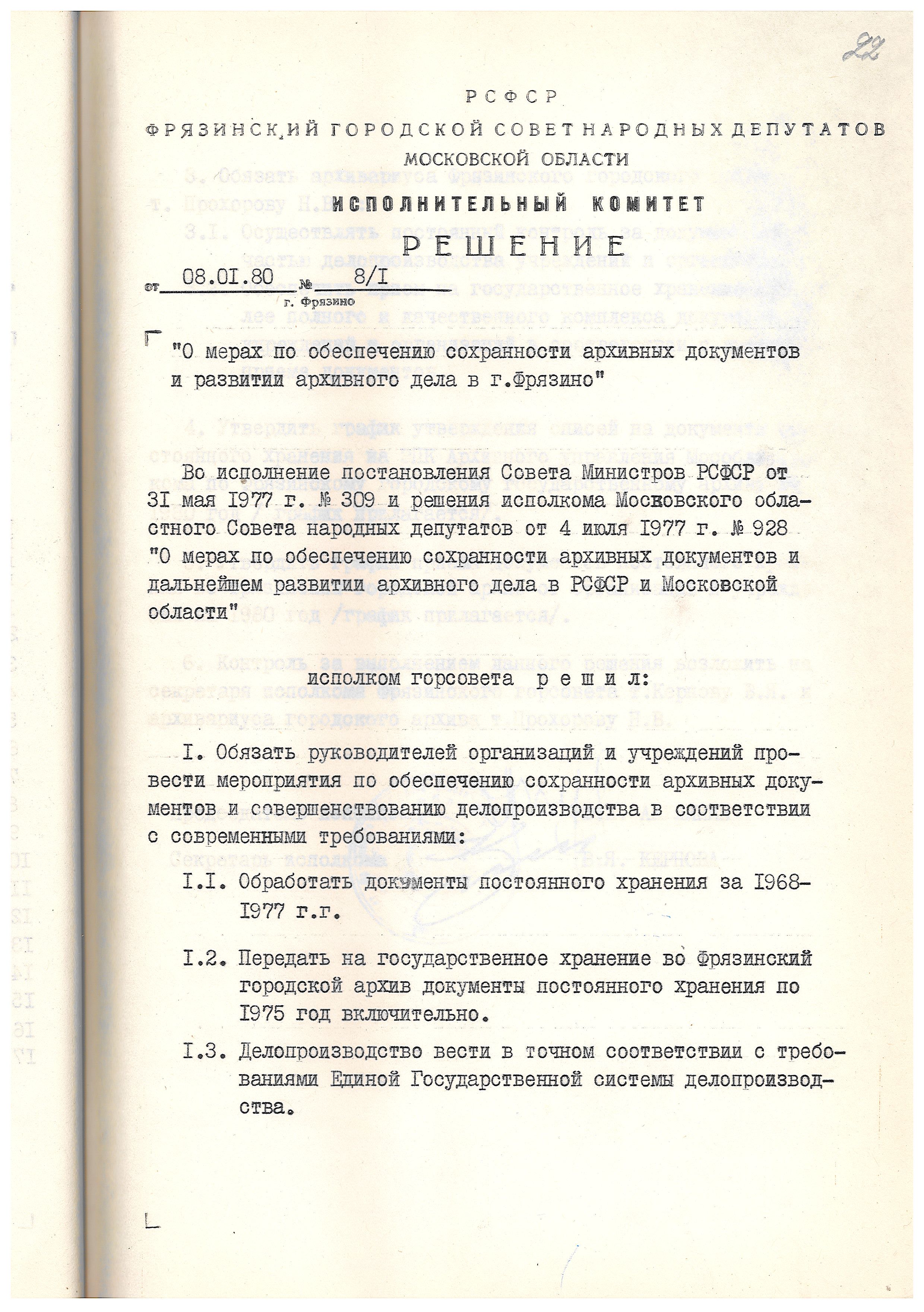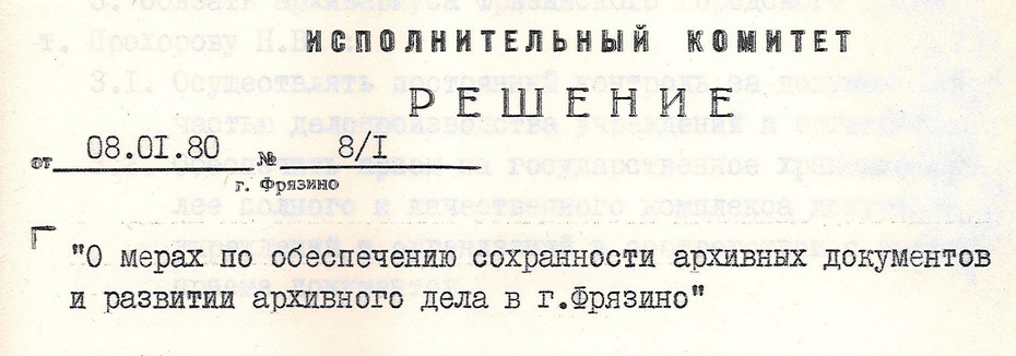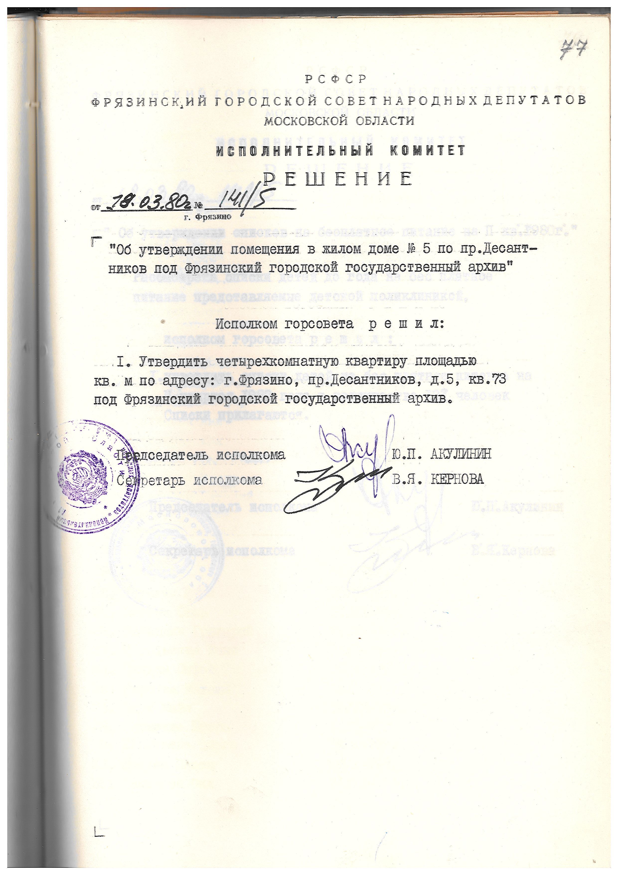 24 декабря 1979 года на должность архивариуса Фрязинского городского государственного архива была зачислена Прохорова Наталья Викторовна (распоряжение от 23.12.1979 № 49, ФМА, ф. № 1,оп. № 2л/с, д. № 113, лл. 23, 70), с июня 1979 года работавшая инженером в управлении коммунального хозяйства исполкома, в 1976-1982 гг. проходившая обучение на заочном отделении Московского государственного историко-архивного института (МГИАИ) по специальности историко-архивоведение. Таким образом, началась история Фрязинского муниципального архива. В марте 1980 года под архив была выделена четырехкомнатная квартира на первом этаже жилого дома по проезду Десантников, дом 5 (решение исполкома от 18.03.1980 № 141/5 “Об утверждении помещения в жилом доме № 5 по пр. Десантников под Фрязинский городской государственный архив”. (ФМА, ф. № 1, оп. № 1, д. № 556, л. 77)