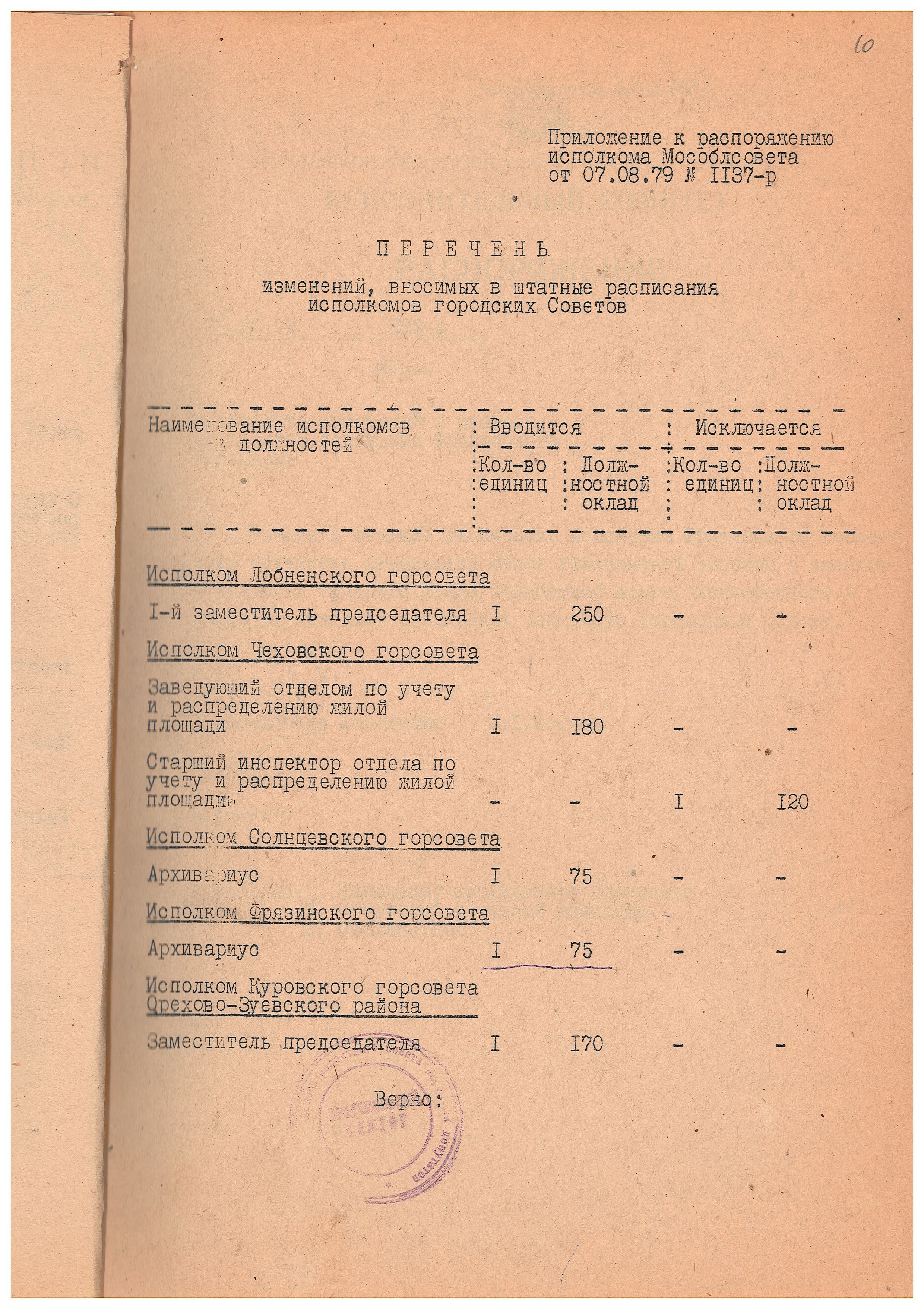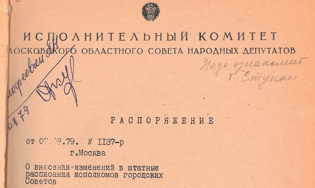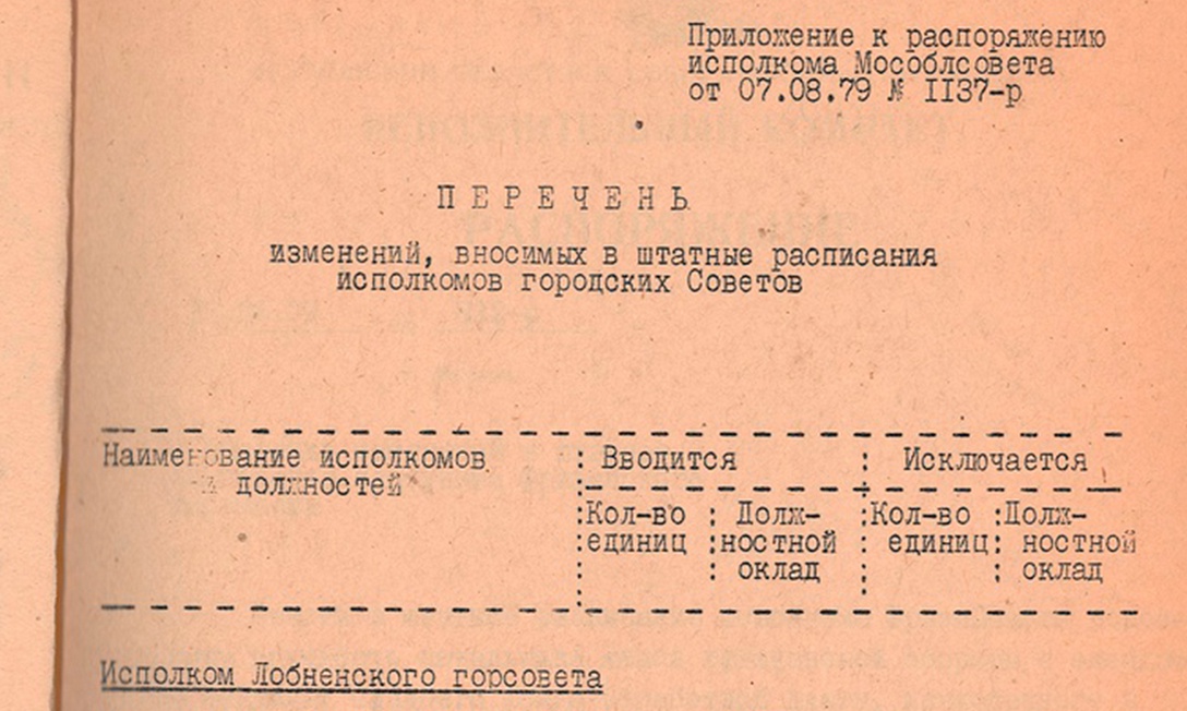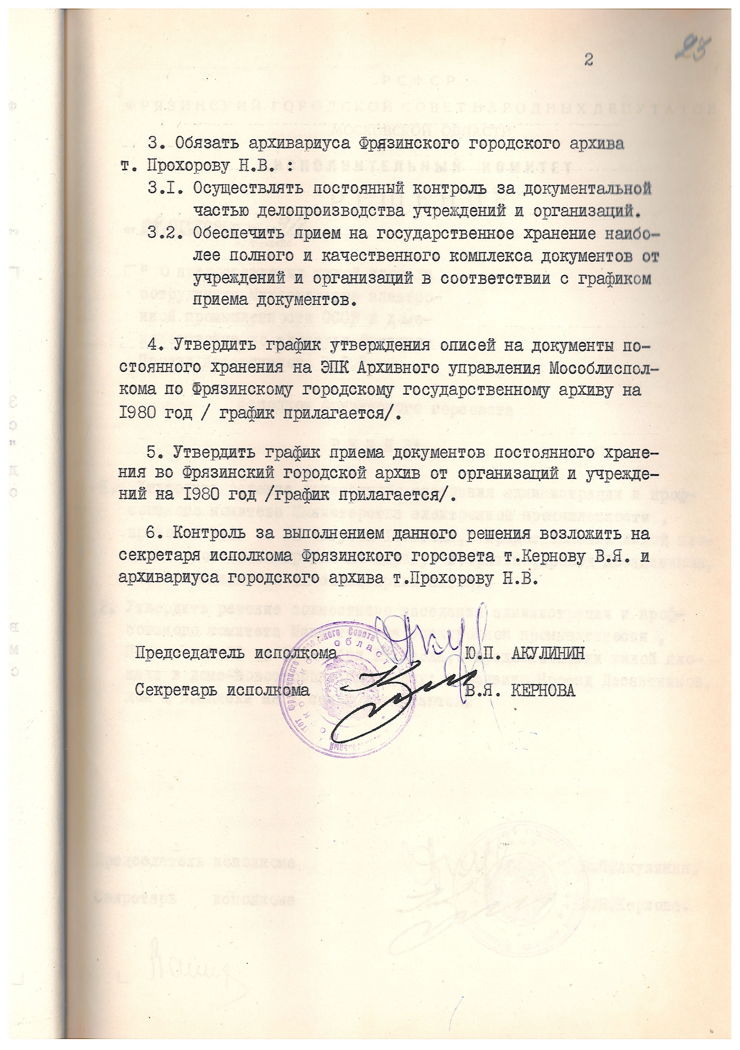 24 декабря 1979 года на должность архивариуса Фрязинского городского государственного архива была зачислена Прохорова Наталья Викторовна (распоряжение от 23.12.1979 № 49, ФМА, ф. № 1,оп. № 2л/с, д. № 113, лл. 23, 70), с июня 1979 года работавшая инженером в управлении коммунального хозяйства исполкома, в 1976-1982 гг. проходившая обучение на заочном отделении Московского государственного историко-архивного института (МГИАИ) по специальности историко-архивоведение. Таким образом, началась история Фрязинского муниципального архива. В марте 1980 года под архив была выделена четырехкомнатная квартира на первом этаже жилого дома по проезду Десантников, дом 5 (решение исполкома от 18.03.1980 № 141/5 “Об утверждении помещения в жилом доме № 5 по пр. Десантников под Фрязинский городской государственный архив”. (ФМА, ф. № 1, оп. № 1, д. № 556, л. 77)