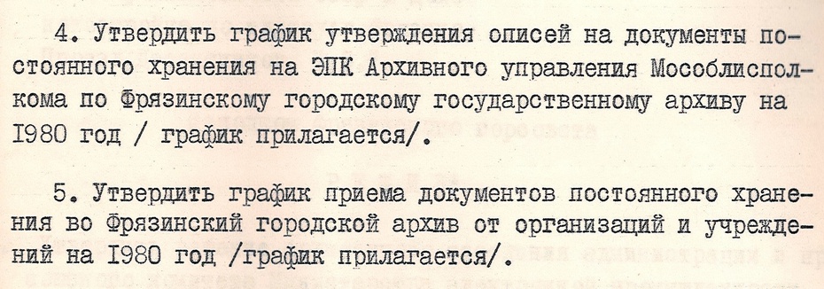 В январе 1980 года решением исполкома утверждены график утверждения описей на документы постоянного хранения за 1968-1977 гг. и график приема документов в архив. Первые документы постоянного (вечного) срока хранения поступили в архив в марте 1981 года, когда Щёлковский районный архив возвратил переданные им ранее на хранение документы Фрязинского городского Совета депутатов трудящихся за 1952-1974 гг. (333 ед. хр.), Фрязинского техникума электронных приборов за 1945-1974 гг. (296 ед. хр.). Результатом активной деятельности первого архивариуса Натальи Виктороны Прохоровой по организации упорядочения архивных документов в организациях – источниках комплектования архива стало то, что уже в 1981 году на хранение поступили архивные документы Фрязинского городского финансового отдела за 1969 -1974 гг. и Фрязинской городской плановой комиссии за 1968-1978 гг., а в 1982 году Фрязинского городского отдела народного образования за 1969-1977 гг., Фрязинского городского комитета по физической культуре и спорту за 1976-1980 гг., Инспектора по культуре за 1968-1980 гг. Всего за два года в архив поступило более 1100 единиц хранения. В 1984 году Прохорова Н.В. уволилась по собственному желанию (в том же году она возглавила Щёлковский городской государственный архив), и на должность архивариуса Фрязинского городского государственного архива 26 ноября 1984 года приняли Паршину (Грущенко) Людмилу Николаевну, также окончившую МГИАИ. К концу 1990 года Список организаций-источников комплектования архива насчитывал 8 организаций. На хранение поступили документы Фрязинской центральной городской больницы за 1968-1983 гг., Отдела главного архитектора за 1950-1980 гг., пополнились уже имеющиеся фонды. Объем хранящихся документов составил более 2800 единиц хранения, 10 фондов. С целью обеспечения сохранности архивных документов постоянного хранения, подлежащих приему в архив, работники горгосархива проводили большую работу с организациями-источниками комплектования. Регулярно проводились проверки организации делопроизводства, условий хранения архивных документов, своевременности составления номенклатур дел и проведения научно-технической обработки архивных документов учреждений. 26 октября 1990 года Паршина Л.Н. уволилась в связи с изменением места жительства (распоряжение от 28.09.1990 № 2-17/119; ФМА, ф. № 1, оп. № 2л/с, д. № 166, л. 120). Ведение справочной работы по документам архива неофициально было возложено на специалиста ΙI категории общего отдела исполкома Васильеву Татьяну Ивановну, окончившую в 1973 году МГИАИ по специальности историко-архивоведение. 9 января 1992 года распоряжением от 09.01.1992 № 5 Васильева Т.И. переведена на должность заведующего Фрязинским городским государственным архивом. Постановлением Главы администрации от 08.04.1992 № 303 «О назначении руководителей отделов», изданном на основании постановления главы администрации от 02.01.1992 № 02 «О порядке назначения на должность Администрации г. Фрязино» и решения VII сессии 21 созыва Фрязинского горсовета от 07.04.1992 № 7_47 «Об утверждении структуры городской Администрации», Васильева Т.И. была назначена заведующим Фрязинским городским государственным архивом (ФГА, ф. № 1, оп. № 2л/с, д. № 166, л. 96; ф. № 75, оп. № 1 д. № 46, л. № 108; д. № 46, л. 7;д. № 17, л. 108 ). Васильева Т.И. вспоминает, какое удручающее впечатление произвело помещение архива при первом его посещении: «Вместо выв
