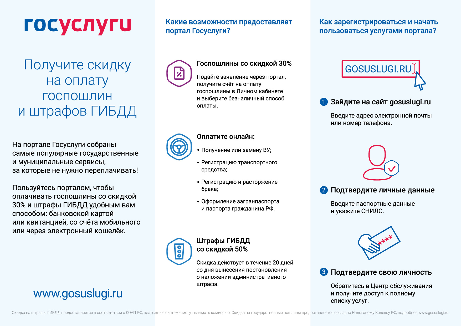 Оформление паспорта гражданина РФ. Электронная госуслугаЕсли вам исполнилось 20 или 45 лет, у вас испортился или потерялся паспорт, изменилось имя, личные данные или внешность, эта услуга для вас. С ее помощью вы легко подадите документы на новый паспорт и вас пригласят, чтобы его получить. Как оформить паспорт гражданина: 1. Заполняете электронное заявление на портале госуслуг 2. Оплачиваете госпошлину 3. Приносите оригиналы документов в отделение ФМС, отдаете их без очереди 4. Вас приглашают в ФМС к определенному времени, чтобы забрать новый паспорт. Если время неудобное, его можно изменить Вам потребуется старый паспорт (или справка из полиции) и любые документы, отметки из которых должны стоять в новом паспорте: военный билет, свидетельства о рождении детей и т. д. Услуга доступна пользователям портала, которые подтвердили личность в центре регистрации, по почте или с помощью электронной подписи. Подробнее на портале госуслуг → Постановка машины на учет в ГИБДД. Электронная госуслугаЕсли вы купили машину, мотоцикл или другое транспортное средство, его нужно поставить на учет в отделении ГИБДД и получить свидетельство о госрегистрации. Электронная госуслуга поможет легко подать документы на регистрацию. Как поставить машину на учет: 1. Заполняете электронное заявление на портале госуслуг 2. Оплачиваете госпошлину 3. Приносите оригиналы документов в отделение ГИБДД без очереди 4. Вас приглашают в ГИБДД к определенному времени, чтобы забрать готовые документы. Если время неудобное, его можно изменить Вам потребуется ПТС, акт осмотра транспортного средства, полис ОСАГО и документы, которые подтверждают ваше право на машину — например, договор купли-продажи. Услуга доступна пользователям портала, которые подтвердили личность в центре регистрации, по почте или с помощью электронной подписи. |
