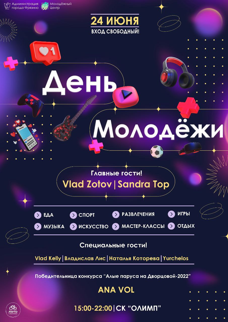 Остались считанные дни до главного праздника всей молодежи🔥 24 июня состоится долгожданное мероприятие на территории СК «Олимп». Вас ждет 👇 – Зажигательная музыка; – Развлечения и интересные мастер-классы; – Море эмоций и хорошее настроение; – Лотерея с крутыми призами. 🎵Главные гости Vlad Zotov и Sandra Top исполнят для вас свои самые лучшие хиты. В рамках Дня молодежи также состоятся баскетбольный и волейбольный турниры. 😉 Следите за новостями, вас ждёт еще много сюрпризов! |