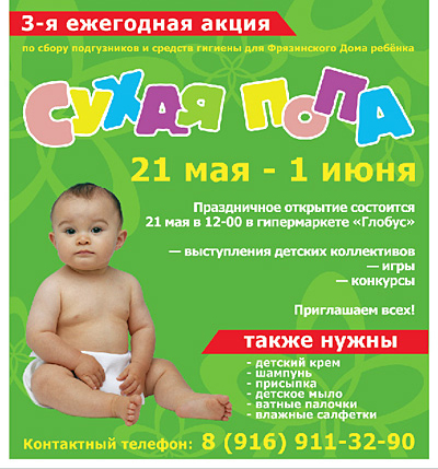21 мая стартует благотворительная акция «Сухая попа»по сбору подгузников и средств гигиены для детей-сирот Фрязинского специализированного дома ребенка.