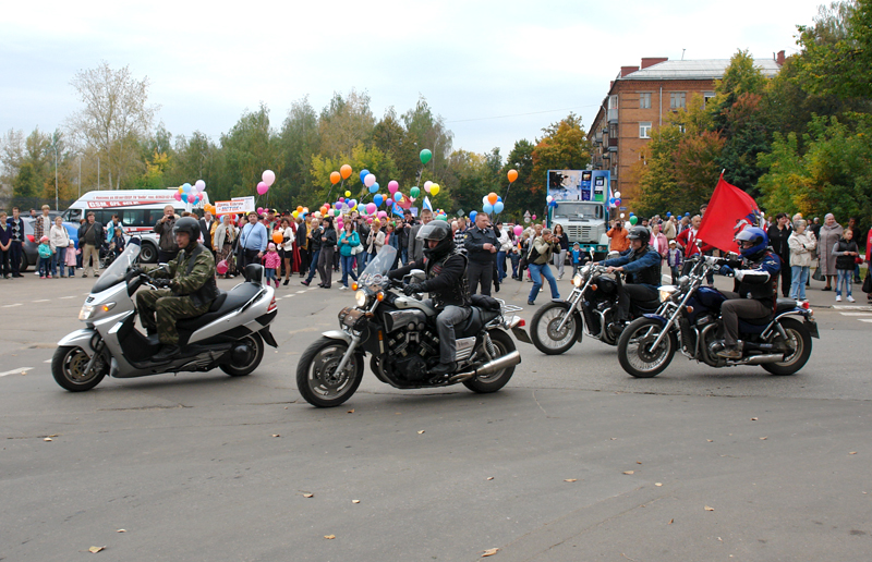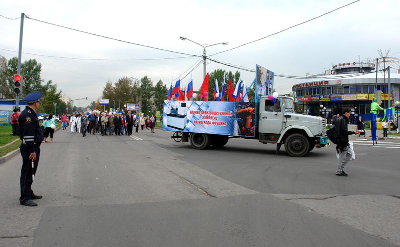 Красочным зрелищем стало традиционное праздничное шествие. В этом году его участников было заметно больше. Открыли демонстрацию байкеры из мотоклуба «MOTO-INVASION» и любители внедорожной езды автоклуба 4х4. Следом под музыку духового оркестра отправились коллективы фрязинских предприятий, учреждений культуры, спорта и молодежи. Торжественным маршем с флагами, цветами и воздушными шарами они прошли через весь город.