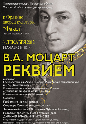 Прослеживая определенную профессиональную связь между двумя музыкантами и совпадение даты смерти великого непревзойденного композитора В.А.Моцарта с датой закрытия фестиваля, было принято решение исполнить «Реквием» - самое загадочное произведение, написанное для большого хора, солистов и оркестра.