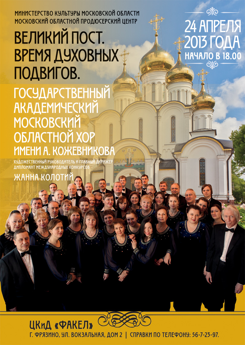 24 апреля в 18-00 в ЦКиД «ФАКЕЛ» Государственный академический Московский областной хор им. А.Кожевникова представляет программу «Великий пост. Время духовных подвигов».