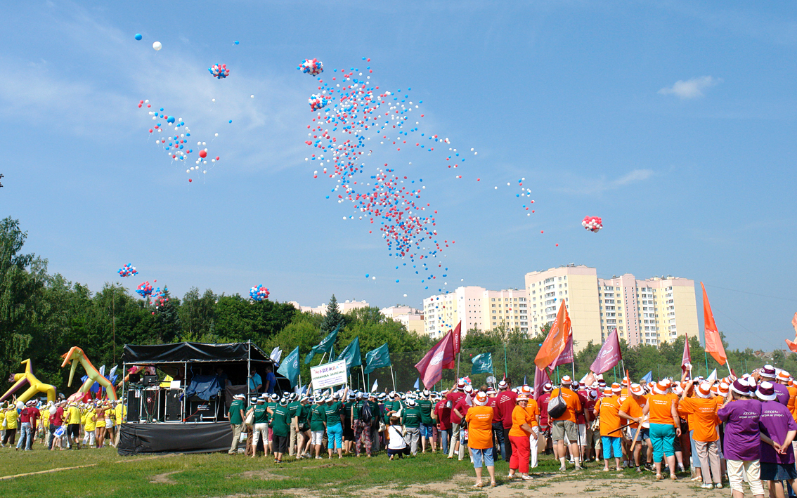 Однако истоковцы играли на площадках не только ради удовольствия, но и на результат. Весь коллектив поделился на восемь команд, которые отличались цветом футболок, девизом и названием, придуманными заранее. За каждое выигранное состязание – групповое или индивидуальное, команда получала игровой шарик, который несла в свою копилку. Члены девятой команды – красных, в которую вошли ветераны «Истока», могли также участвовать в соревнованиях и отдавать свои заработанные шарики той команде, которая им больше нравится. Таким образом, ко второй половине дня каждая команда имела увесистую колбу из шариков, пересчитывать которые взялось независимое жюри.