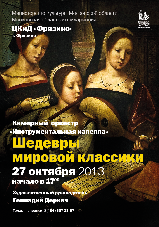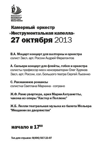 27 октября Московская областная филармония приглашает поклонников классической музыки в ЦКИД «Факел» г. Фрязино на концерт камерного оркестра «Инструментальная капелла». В программе «Шедевры мировой классики» прозвучат произведения В.А. Моцарта, А. Сальери, романсы С. Рахманинова и другие. Начало в 17:00.