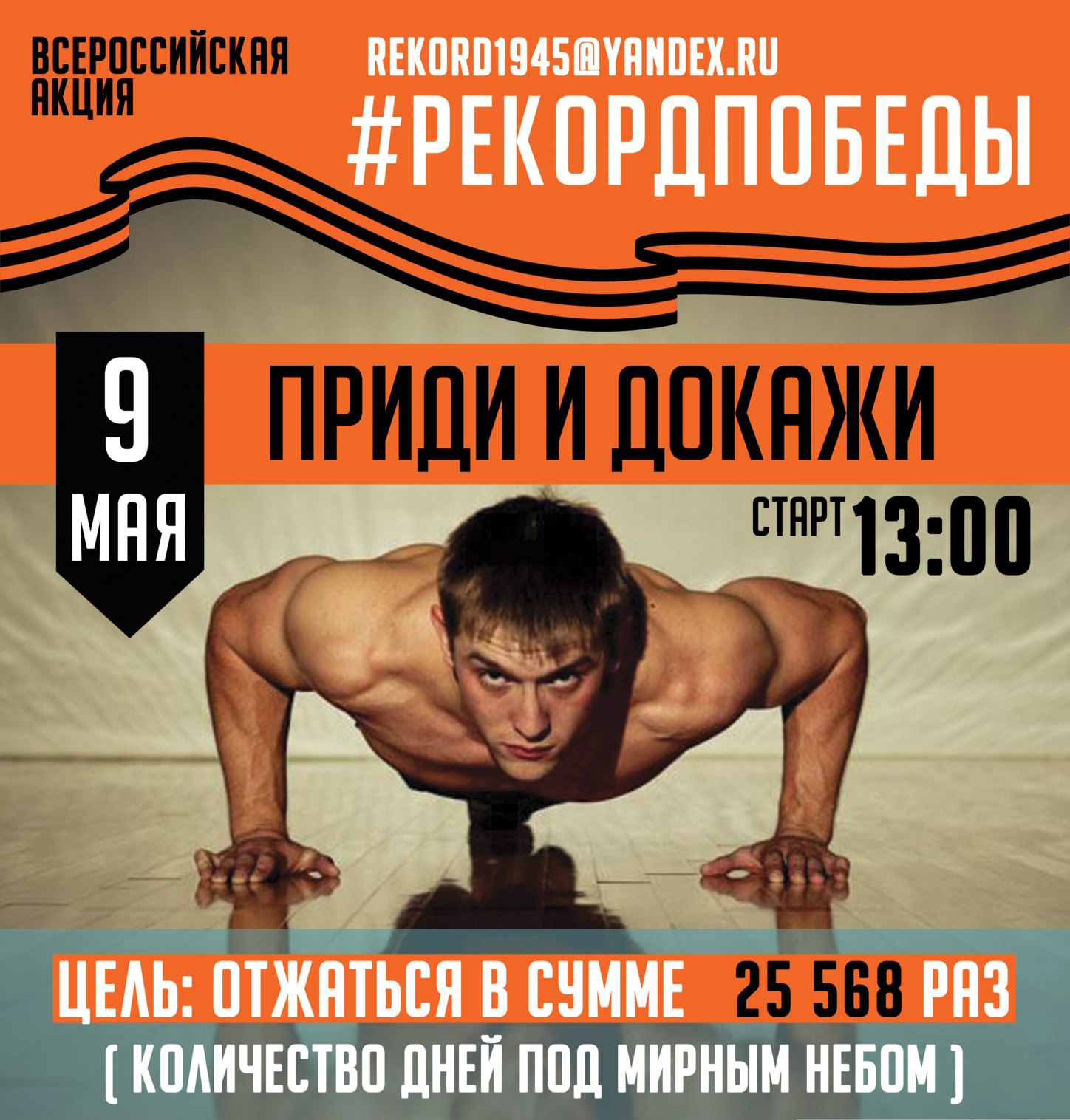 Всероссийская акция «Рекорд Победы»9 мая в десятках городов России пройдет акция – «Рекорд Победы» в рамках празднования 70-летия Победы в Великой Отечественной Войне. Этот, не знающий российских аналогов, флешмоб в четвертый раз прокатится по стране. И в этом году мы планируем перевернуть привычное мнение о сегодняшней молодежи и показать всему миру, что в России растет поколение, достойное своих предков, бесстрашно сражавшихся за Родину! 9 мая 2015 года на крупные площади российских городов и поселений выйдут порядка 20 тысяч местных жителей, которые не словом, а делом отдадут дань нашим дедам за мирное небо над головой. Ровно в 13:00в своих городах участники начнут выполнять упражнение «отжимание» по одному разу за каждый прожитый мирный день с момента окончания Войны. В этот юбилейный год участники «Рекорда Победы»в каждом из городов отожмутся по25 тысяч 568 раз!