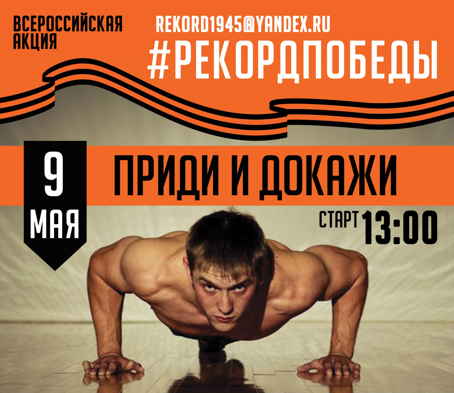 9 мая в десятках городов России пройдет акция – «Рекорд Победы» в рамках празднования 70-летия Победы в Великой Отечественной Войне. Этот, не знающий российских аналогов, флешмоб в четвертый раз прокатится по стране. И в этом году мы планируем перевернуть привычное мнение о сегодняшней молодежи и показать всему миру, что в России растет поколение, достойное своих предков, бесстрашно сражавшихся за Родину!