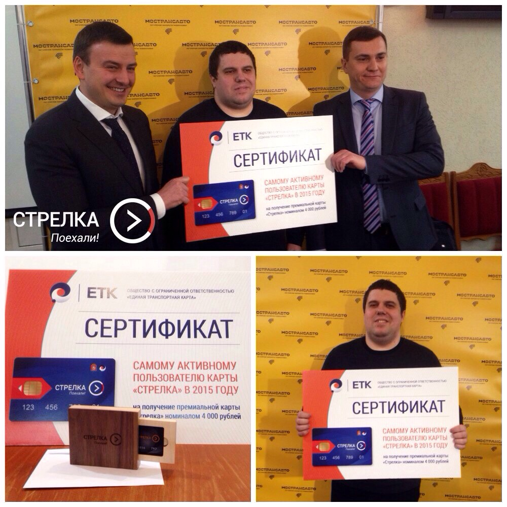 В Подмосковье наградили самого активного пользователя «Стрелки» за 2015 год 25 февраля в ГУП МО «Мострансавто» состоялось награждение самого активного пользователя единой транспортной карты Подмосковья «Стрелка». Генеральный директор ГУП МО «Мострансавто» Александр Зайцев и генеральный директор ООО «ЕТК» Павел Буяджи вручили жителю г. Пересвета Сергиево-Посадского муниципального района Павлу Трухину памятный подарок. Это премиальная карта «Стрелка» с 4-мя тысячами рублей на балансе и подарочный сертификат.