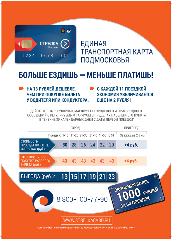 Карта «Стрелка» проста в использовании и позволяет пассажиру экономить на проезде. Так, при использовании «Стрелки» в течение 30 дней с даты первой поездки стоимость проезда на маршрутах городского и пригородного сообщений с регулируемым тарифом в пределах населенного пункта снижается с 30 до 20 рублей (первые 10 поездок – по 30 рублей, следующие 10 поездок – по 28 рублей и так далее, вплоть до 20 рублей за поездку).На сегодняшний день жителямМосковской области удалось сэкономить благодаря «Стрелке» более 230 миллионов рублей.