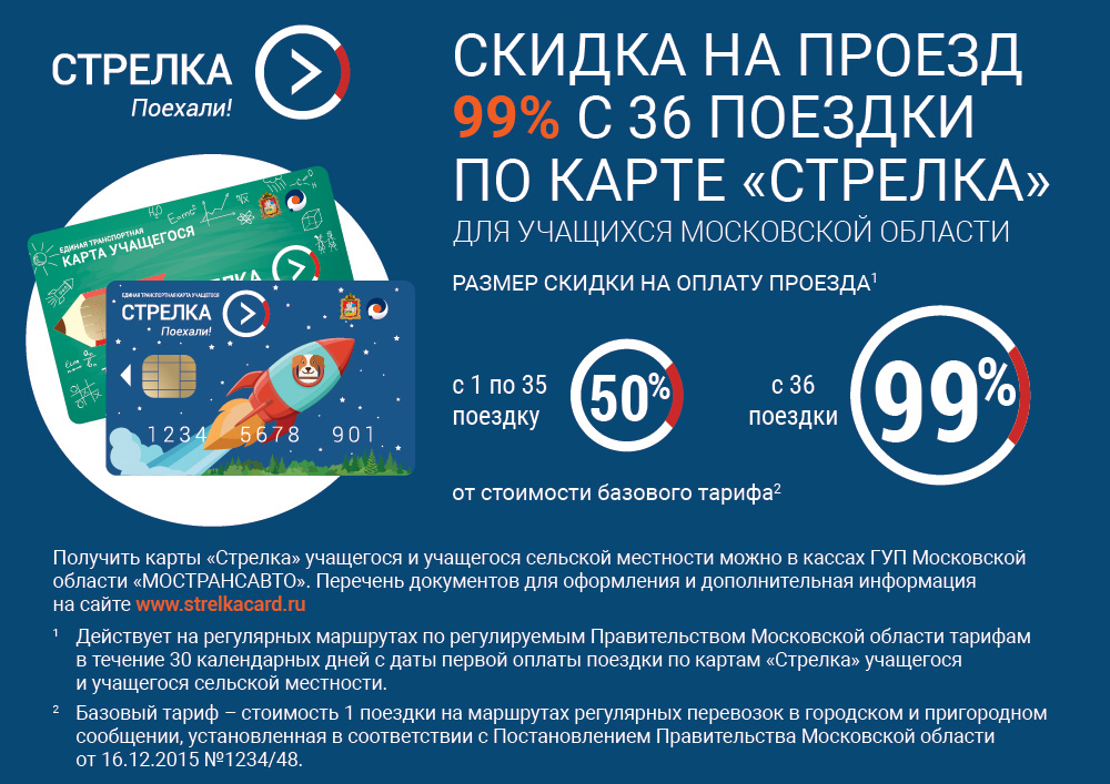 С 1 февраля изменились тарифы на оплату проезда картой «Стрелка» учащегося и учащегося сельской местности. Теперь с 36-ой поездки школьникам и студентам Подмосковья предоставляется скидка в размере 99%.