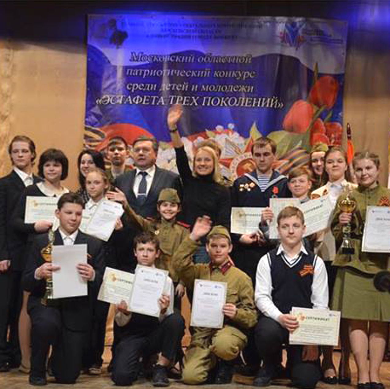 Эстафета трех поколений31 марта в Центре культуры и досуга «Факел» во Фрязино состоялся финальный этап Московского областного патриотического конкурса среди детей и молодежи «Эстафета трех поколений». Победители муниципальных этапов состязания со всего Подмосковья показали свои проекты в области патриотического воспитания. Участников конкурса приветствовал Глава города Фрязино Игорь Сергеев. Мероприятие было организовано Главным управлением социальных коммуникаций Московской области и администрацией города. Среди почетных гостей мероприятия были начальник Главного управления социальных коммуникаций Ирина Плещёва, а также призер Олимпийских игр, многократная чемпионка мира и Европы по фигурному катанию Ирина Слуцкая. Победителем «Эстафеты трех поколений» стала Мария Евдокимова из Красногорского района. Как сообщило Фрязинское информагентство, она получила диплом, Кубок и сертификат на путевку в детский лагерь «Орленок».