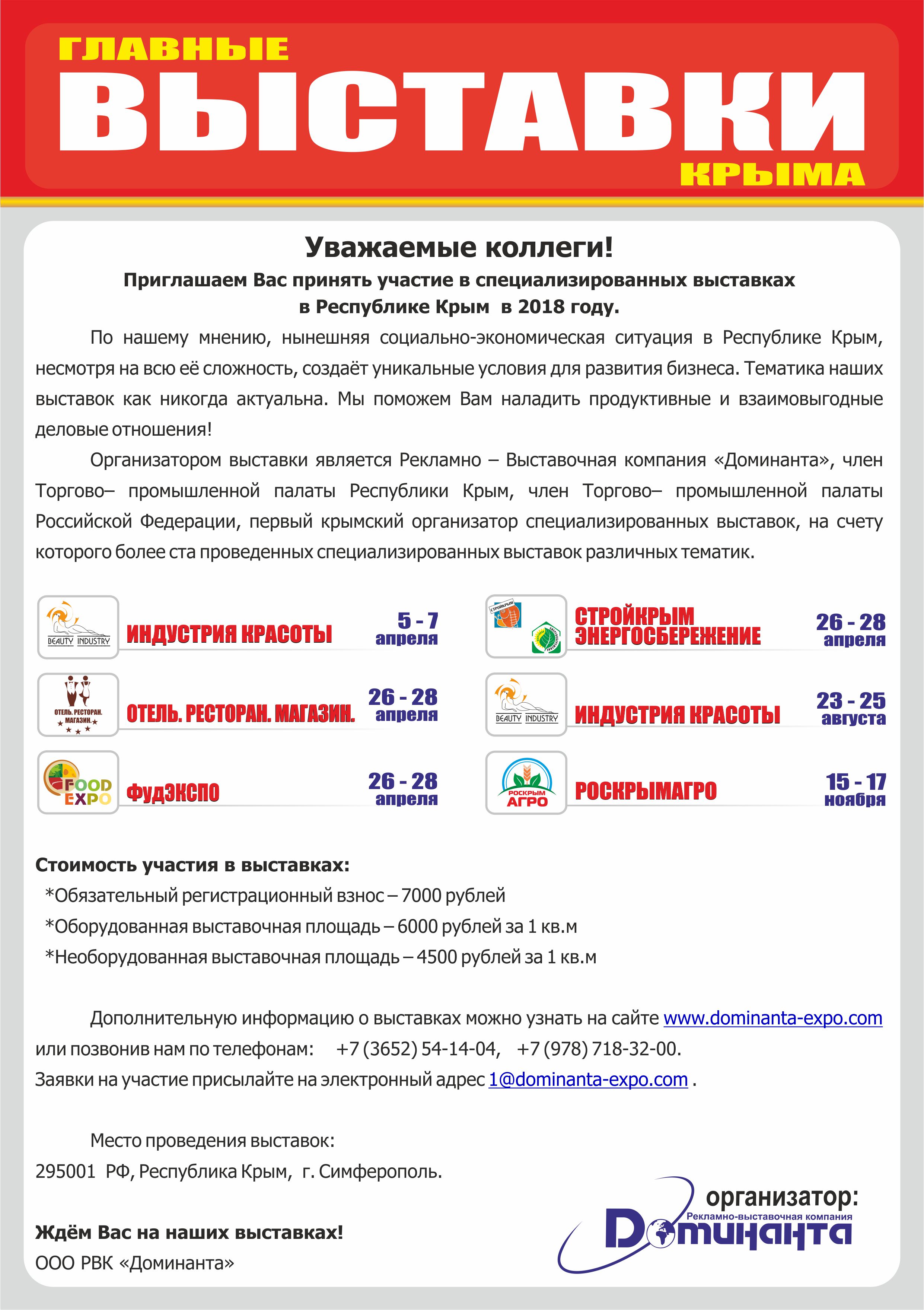 Министерство потребительского рынка и услуг Московской области информирует о плане выставок на 2018 год рекламно-выставочной компании ООО «Доминанта» (г. Симферополь, Республика Крым), члена ТПП Российской Федерации.