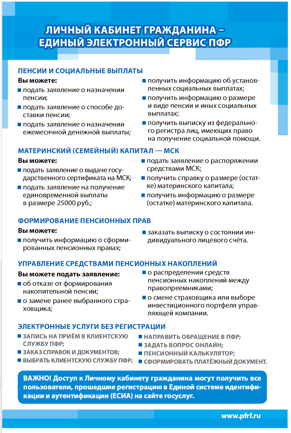 В настоящее время на официальном сайте Пенсионного фонда России можно: получить информацию о сформированных пенсионных правах; получить выписку о состоянии индивидуального лицевого счета; назначить пенсию, изменить способ ее доставки; подать заявление о назначении ЕДВ; получить информацию и заказать справку о размере пенсии и установленных социальных выплатах, а также выписку из федерального регистра лиц, имеющих право на получение социальной помощи; рассчитать будущую страховую пенсию с учетом сформированных пенсионных прав; контролировать уплату страховых взносов работодателем; узнать, кто страховщик по формированию пенсионных накоплений, и многое другое.