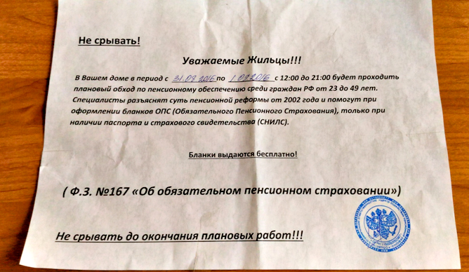 ПФР предупреждает, что лица, занимающиеся деятельностью по пенсионной тематике, обходящие граждан по домам, организующие встречи на дворовых территориях, развешивающие объявления по пенсионной тематике, не имеют никакого отношения к Государственному учреждению – Пенсионный фонд Российской Федерации.