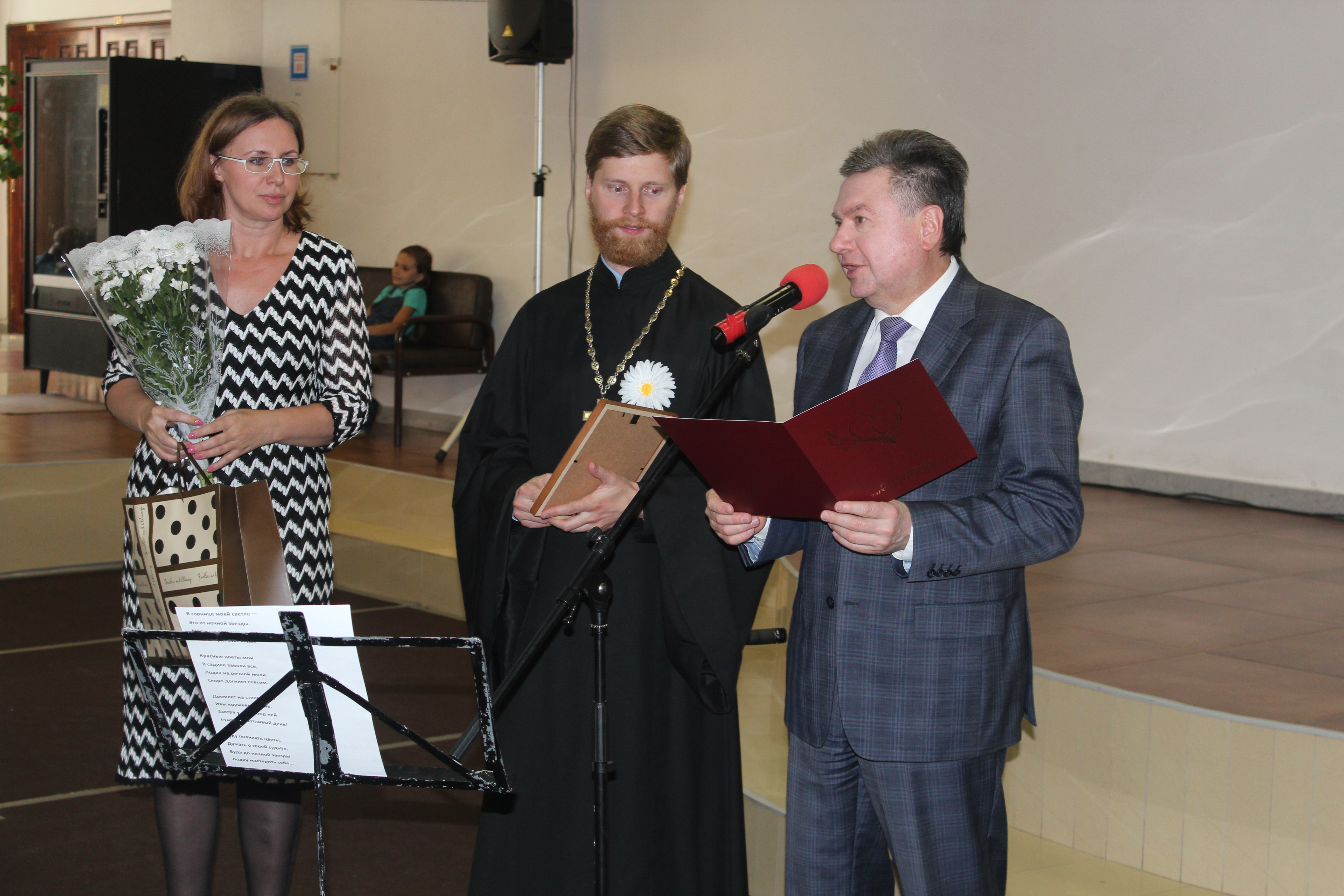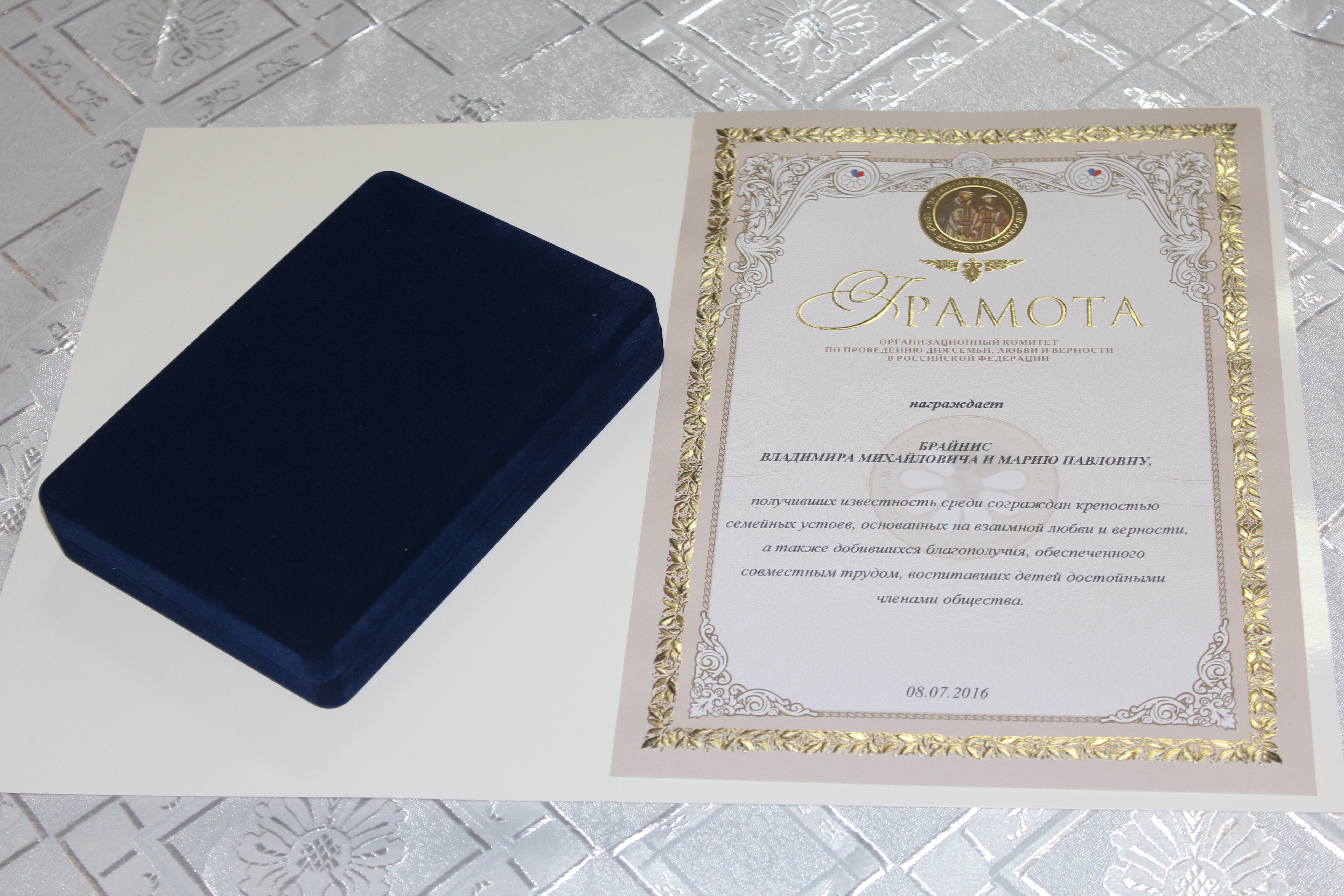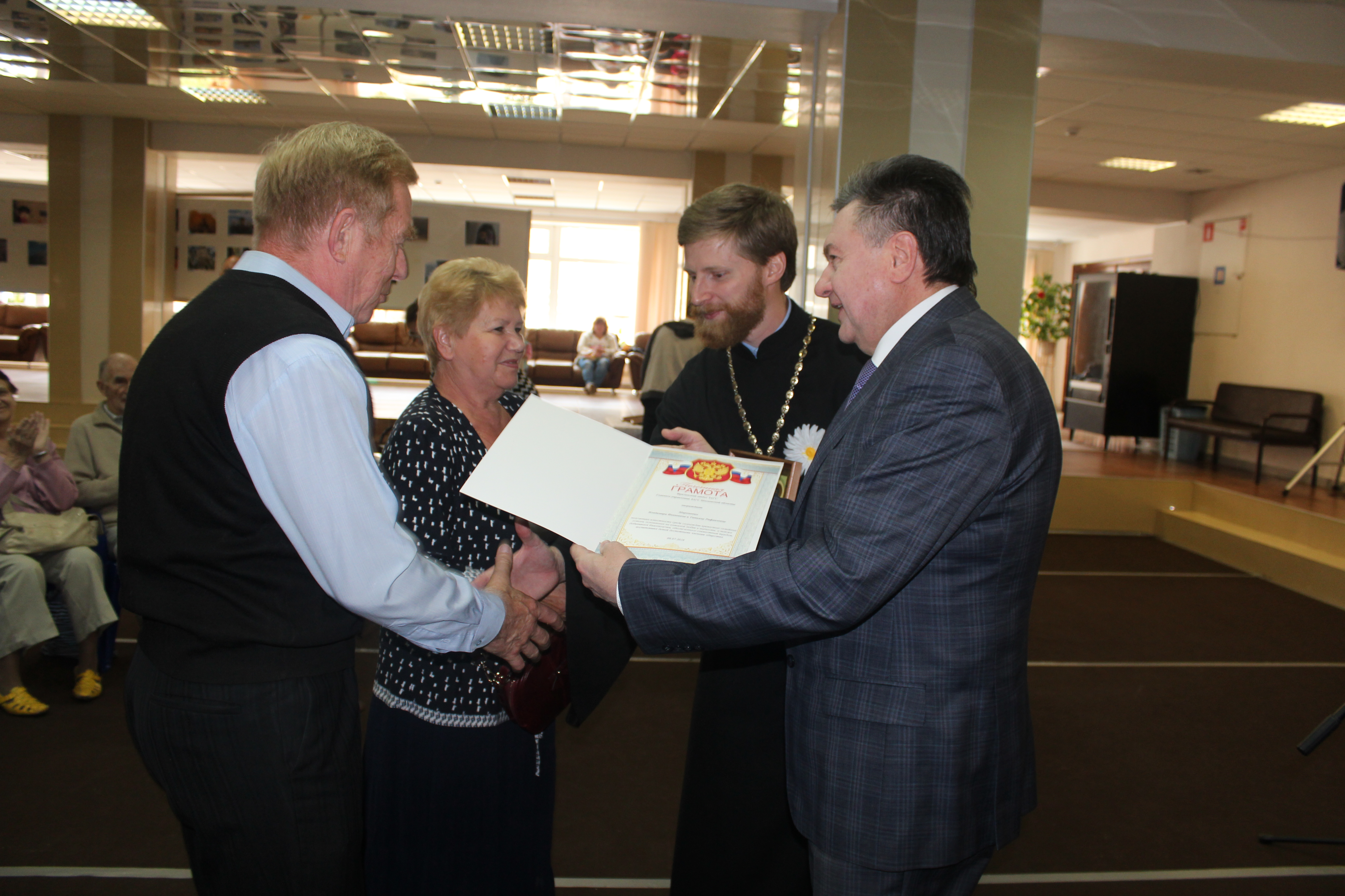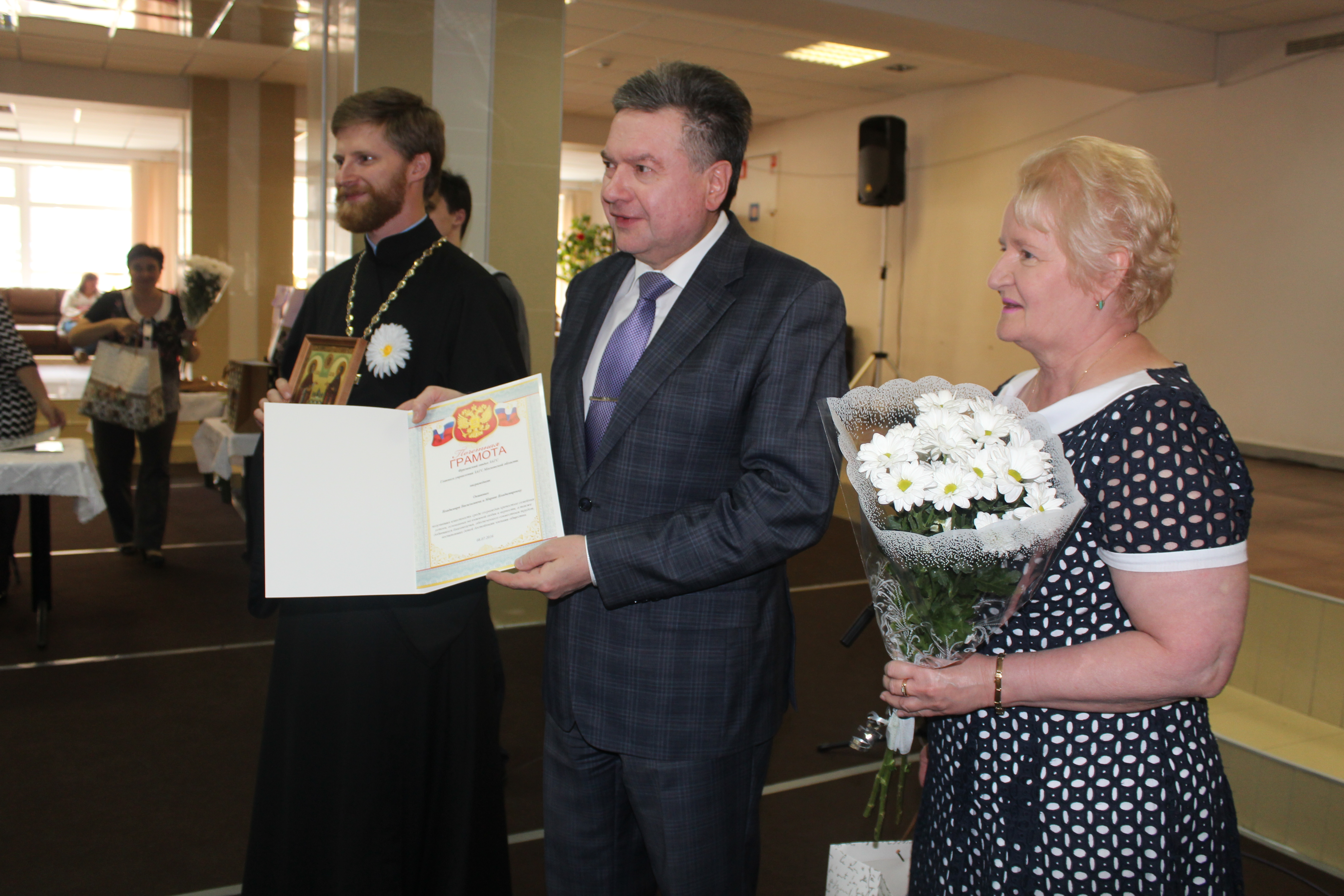 Торжественное мероприятие прошло 8 июля в ДК «Исток». Главными героями праздника стали юбиляры семейной жизни и многодетные семьи. В тёплой атмосфере Дворца культуры «Исток» их приветствовали Глава города Фрязино Игорь Сергеев, настоятель Державного храма города Фрязино иерей Димитрий Поповский, начальник управления культуры, физкультуры и спорта города администрации г. Фрязино Алла Полухина и заведующая Фрязинским отделом ЗАГС Юлия Шувалова. «Всероссийский день семьи, любви и верности – праздник и государственный, и православный. Мы пронесли эти нравственные ценности через века, на них будем строить наше будущее. Президент Российской Федерации Владимир Путин отмечал в своём выступлении важность того, что нам удалось сохранить нравственные основы нашего общества. Присутствующие здесь наши уважаемые юбиляры являются образцом для всех нас, примером для молодых пар, только начинающих совместную жизнь», – отметил в поздравительном слове Глава города Фрязино Игорь Сергеев. «Любовь – это не то, когда мы любим человека за то, что он нам что-то сделал или подарил. Любовь – это когда независимо от того, как он к нам относится, мы желаем искренне, от всего сердца, сделать ему благо. Сегодня мы вспоминаем о тех ценностях, которые начинаются с доброй хорошей семьи», – сказал настоятель Державного храма города Фрязино иерей Димитрий Поповский. Юбилярам семейной жизни торжественно вручили грамоты от оргкомитета по проведению праздника, цветы и памятные подарки от администрации города Фрязино и духовенства. Всего поздравления получили 16 пар. Наибольший совместный срок семейной жизни из присутствовавших – у Владимира Васильевича и Марии Владимировны Окшиных (65 лет); Константина Ивановича Алмазова-Долженко и Раисы Филипповны Виленской (62 года); Владимира Михайловича и Марии Павловны Брайнисов (60 лет). Затем на сцену были приглашены наиболее активные многодетные семьи города Фрязино – семья Алексеевых (фонд «Заботливая семья») и семья Прохоровых (общественная организация «Большая семья наукограда»). «В наукограде Фрязино – 504 многодетные семьи. У нас на протяжении двух месяцев среди многодетных семей проходил фотоконкурс. Участники должны были пояснить в своих работах, чем замечательна именно их семья», – рассказала представитель фонда «Заботливая семья» Ольга Алексеева. Были названы семьи-победители фотоконкурса, которым и вручили призы. Ими стали семья Кириковых – 8 детей, семья Камышовых – 3 ребёнка, и семья Алексеевых – 3 ребёнка. Подарки получили и те дети из многодетных семей, которые отмечают день рождения в июле. Семейный праздник завершился небольшим фуршетом.