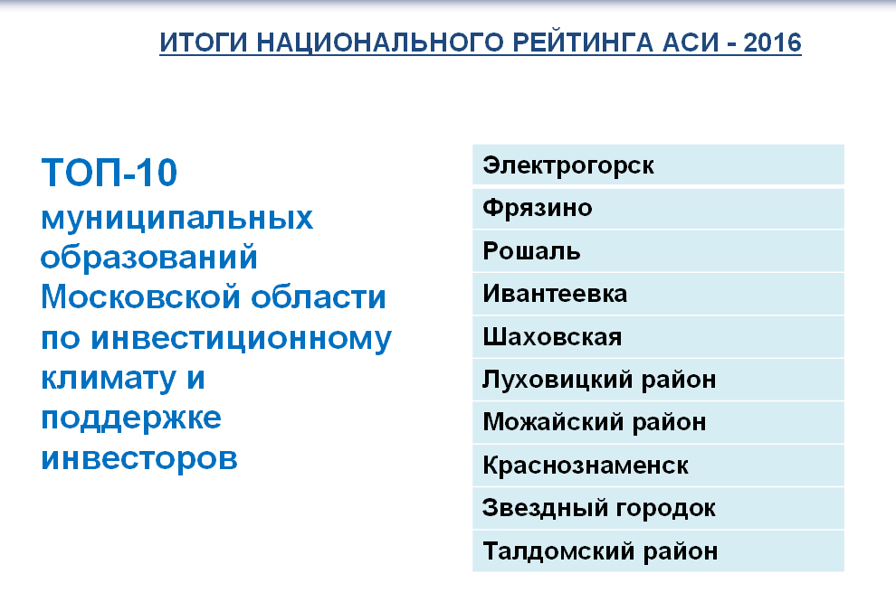 Город Фрязино занял второе место в Подмосковье в национальном рейтинге по инвестиционному климату за 2016 годПодготовкой национального рейтинга по инвестиционному климату занимается Агентство стратегических инициатив (АСИ). Согласно ему, в 2016 году городской округ Фрязино занял второе место в ТОП-10 муниципальных образований Московской области по инвестиционному климату и поддержке инвесторов, на первом месте - город Электрогорск. В десятку лучших также вошли города Рошаль и Ивантеевка, посёлок городского типа Шаховская, Луховицкий и Можайский районы, два ЗАТО - Краснознаменск и Звёздный городок, а также Талдомский район. При составлении национального рейтинга учитывались показатели по таким процедурам, как регистрация юридических лиц, получение разрешения на строительство, регистрация прав собственности, подключение электроэнергии, давление на бизнес, качество и доступность инфраструктуры и поддержка малого предпринимательства. Национальному рейтингу инвестиционного климата, составляемому АСИ, уделяется самое серьёзное внимание на уровне руководства страны. Презентация Национального рейтинга инвестиционного климата в субъектах РФ-2016 состоялась на Петербургском международном экономическом форуме, прошедшем в июне. Победителей поздравил Президент Российской Федерации Владимир Путин. «Я прошу Правительство совместно с деловыми сообществами подумать о дополнительных механизмах поощрения лучших региональных управленческих команд. И напротив, будем принимать серьёзные меры, вплоть до кадровых решений, в отношении тех руководителей регионов, которые не понимают, что поддержка бизнеса - это важнейший ресурс развития региона и всей страны», - сказал Владимир Путин, анализируя результаты Национального рейтинга инвестиционного климата в субъектах РФ-2016.