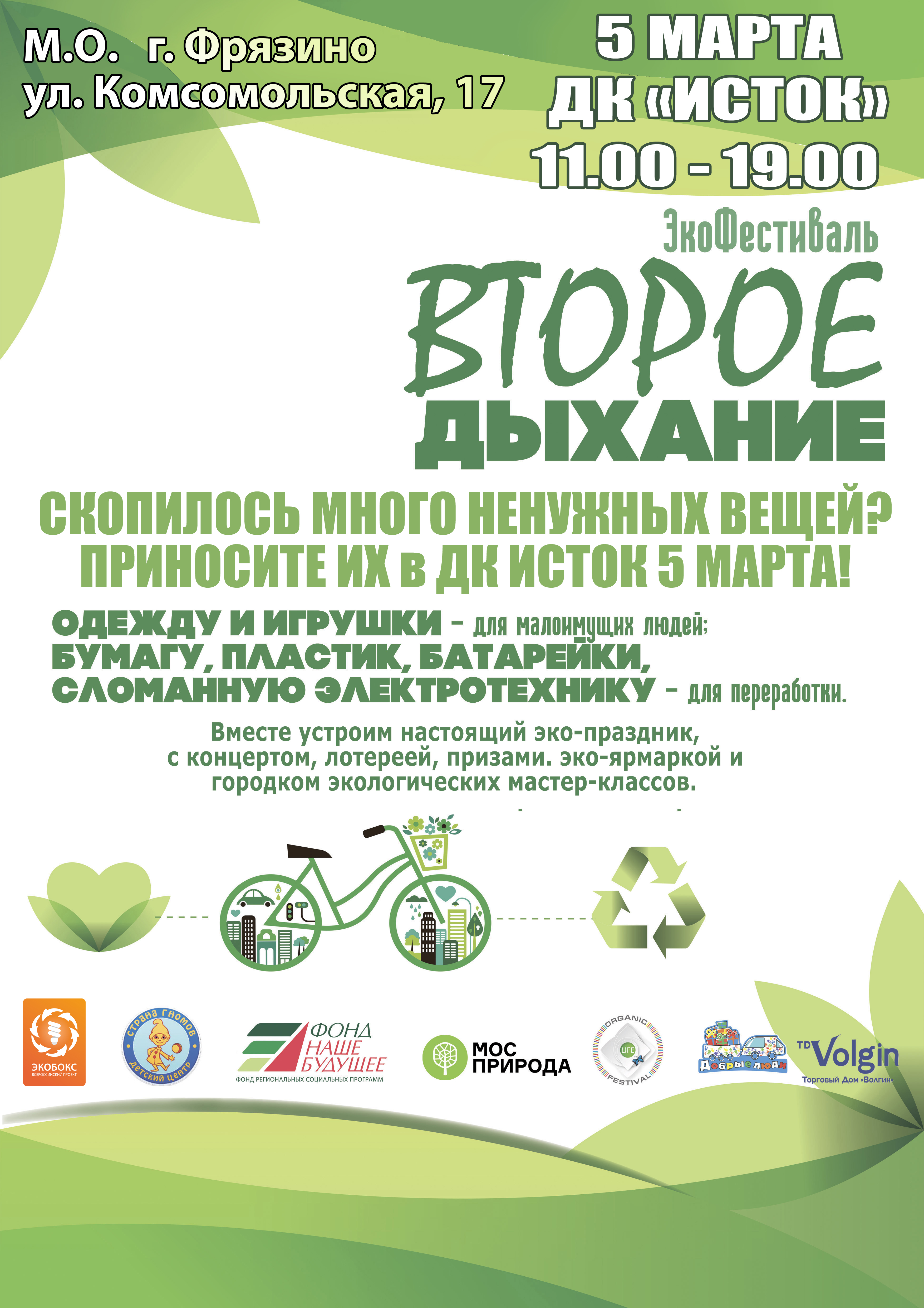 5 марта 2017 года в ДК «Исток», ул. Комсомольская д.17 с 11:00 до 19:00 пройдет первая акция экологического фестивального движения 2017 года «Второе дыхание».