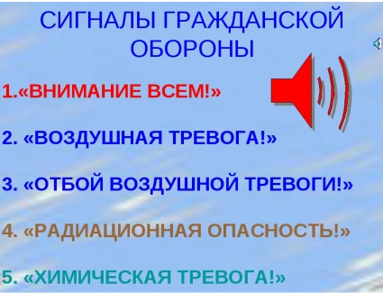 Существует пять сигналов гражданской обороны: «Внимание всем!», «Воздушная тревога», «Отбой воздушной тревоги», «Радиационная опасность», «Химическая тревога». «Внимание всем!» - это предупредительный сигнал. Он подается с целью привлечения внимания населения об аварии, катастрофе, стихийном бедствии, угрозе нападения противника. Сигнал подается способом включения сирен, прерывистых гудков, транспортных и других средств громкоговорящей связи, в том числе установленных на автомобилях службы охраны общественного порядка и ГИБДД. Действия населения: услышав сирену, гудки и т.п., немедленно включите радио, телевизор и прослушайте сообщение регионального МЧС о порядке действий. Полученную информацию передайте соседям, а затем действуйте согласно услышанным правилам. «Воздушная тревога» - этот сигнал предупреждает население о непосредственной угрозе нападения противника. Подается по радиотрансляционным сетям, радиовещательным станциям и телевизионным приёмникам путем передачи текста об опасности и информации о действиях населения. Действия населения: если Вы находитесь дома, необходимо взять с собой личные документы, средства индивидуальной защиты, запас воды и продовольствия, отключить приборы, потребляющие электроэнергию, воду, газ, плотно закрыть окна, форточки, вентиляционные устройства, принять меры по защите продуктов, воды и пищи от возможного заражения, укрыться в ближайшем защитном сооружении (подвал, цокольное помещение здания, убежище). Если сигнал тревоги застал вас на рабочем месте, действуйте согласно инструкции, предусматривающей немедленное прекращение работ с безаварийной остановкой оборудования и переводом процессов непрерывного цикла на безопасный режим работы, с последующим убытием в укрытие. В городском транспорте необходимо выйти из транспорта на ближайшей остановке и действовать по указанию постов ГО, полиции, водителей. В общественных местах действовать по указанию администрации, постов ГО, полиции. Во всех случаях укрыться в ближайшем защитном сооружении, а при его отсутствии – в овраге, насыпи, яме. Сигнал «Отбой воздушной тревоги» извещает население о том, что непосредственной угрозы нападения противника больше нет. Информация о действиях населения передается по радиотрансляционным сетям, радиовещательным станциям и телевизионным приемникам. Сигнал «Радиационная опасность» подается с целью предупредить население о необходимости принять меры защиты от радиоактивных веществ.