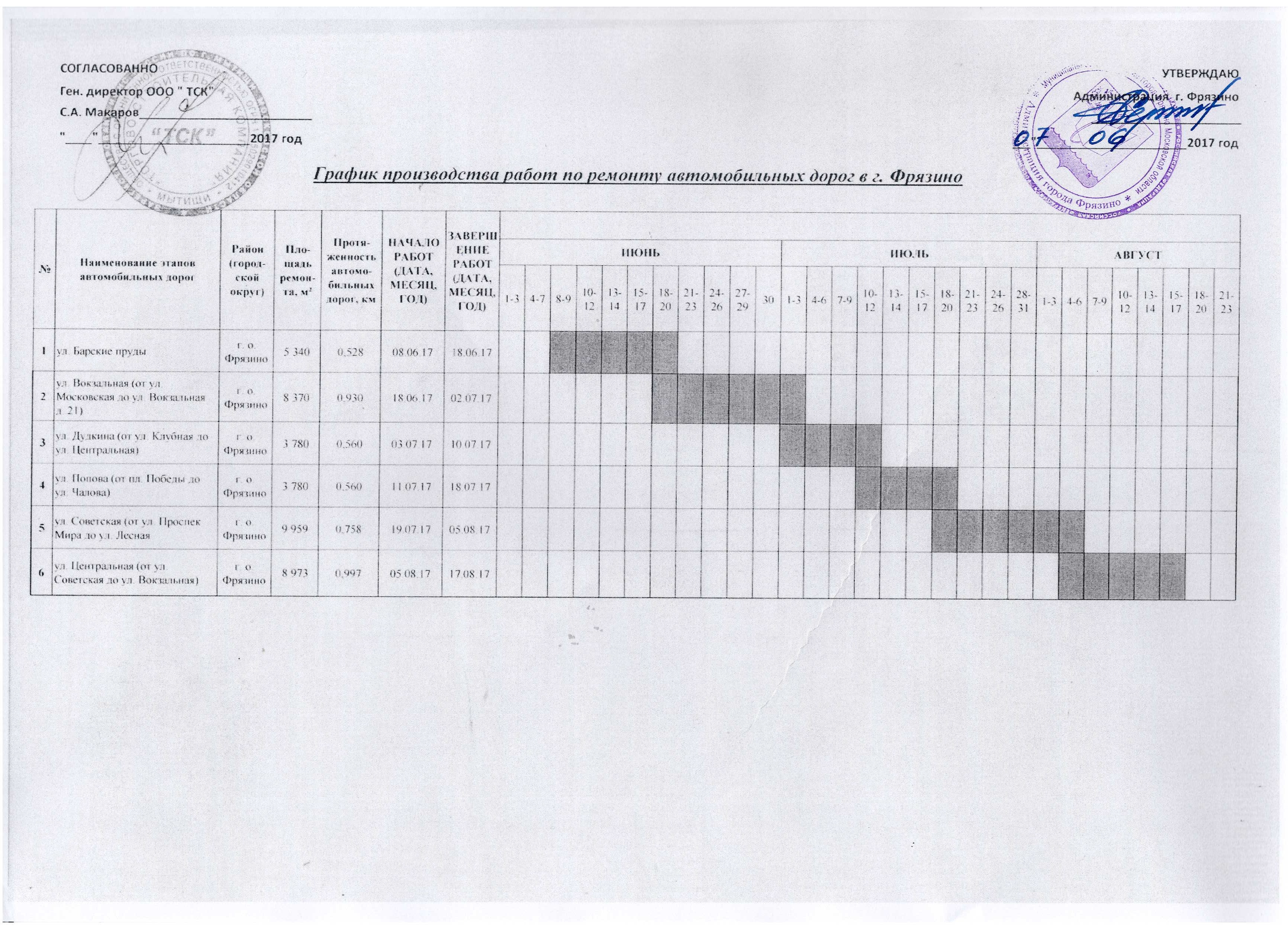 График ремонта автомобильных дорог в г. Фрязино7 июня главой города Игорем Сергеевым утвержден график работ по ремонту автомобильных дорог в г. Фрязино. В соответствии с графиком первым будет производиться ремонт улицы Барские пруды - с 8 по 20 июня. Затем дороги будут ремонтироваться в следующем порядке : ул. Вокзальная (до пересечения с Московской) - с 18 июня по 3 июля; ул. Дудкина - с 3 по 12 июля; ул. Попова - с 12 по 20 июля; ул. Советская - с 20 июля по 6 августа; ул. Центральная - с 6 по 17 августа.