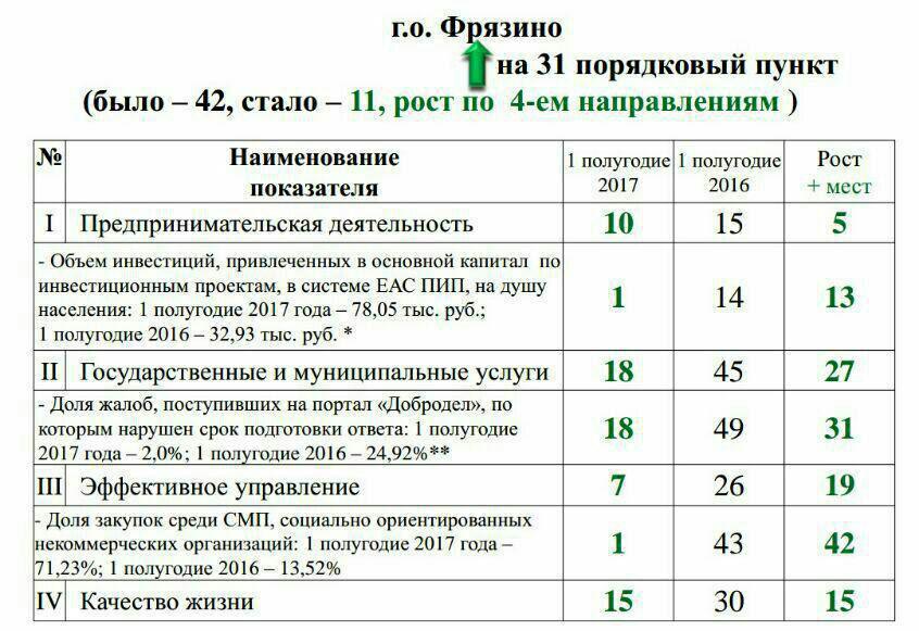 По сравнению с 2016 годом по показателю предпринимательской деятельности город поднялся сразу на пять пунктов, по уровню оказания государственных и муниципальных услуг – на 27 пунктов, по эффективности управления Фрязино поднялся на 19 мест, а по качеству жизни горожан на 15. Поздравляю всех жителей города с этим успехом! Это результат планомерной работы, направленной на то, чтобы наш город становился уютнее и комфортнее для жизни. Это наша общая заслуга!