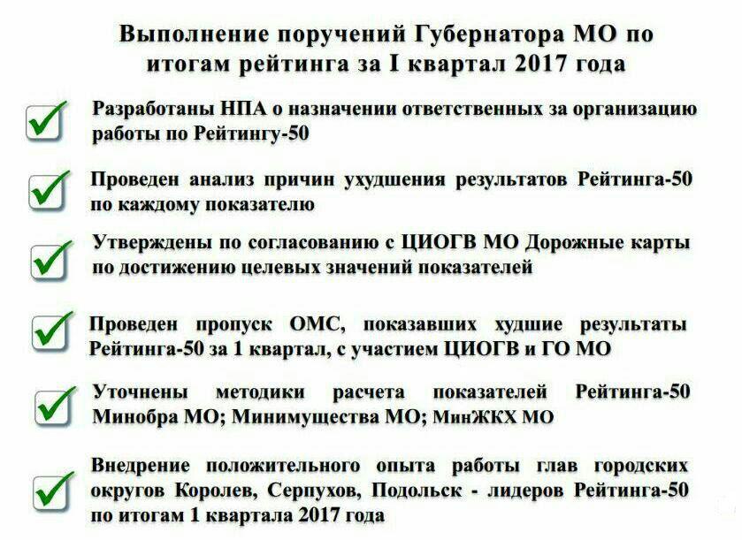 1 августа состоялось заседание Правительства Московской области, на котором был проанализирован «Рейтинг 50» муниципальных образований Московской области. Этот рейтинг основан на Указах Президента РФ, а место в нем определяется по совокупности показателей: во внимание берутся, в частности, программы, разработанные Правительством Московской области. В своем отчете Губернатор Подмосковья Андрей Юрьевич Воробьев огласил итоги за первое полугодие 2017 года, по итогам которого по темпам роста Фрязино поднялся сразу на 31 позицию и занимает 11 место среди 67 муниципалитетов Московской области.