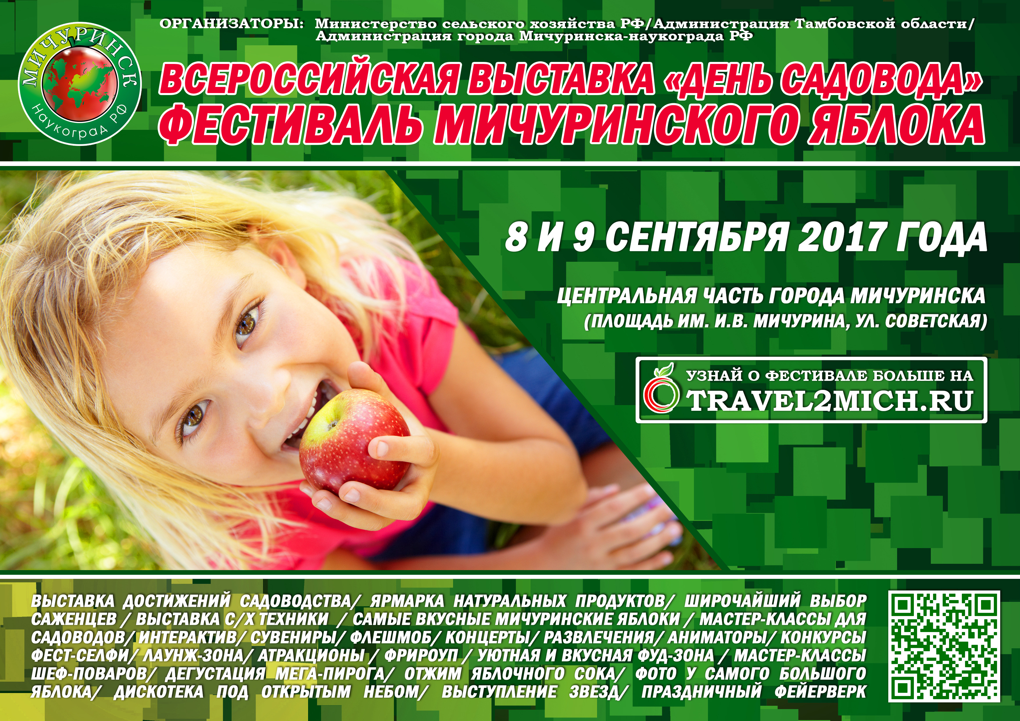 В стране садоводами считают себя более 50 миллионов человек. Ежегодно для участия в наукоград прибывают порядка 500 ученых – садоводов со всех уголков нашей страны и из-за рубежа. На выставочной площадке размещаются экспозиции сотен предприятий и институтов садоводческой отрасли, ярмарочную площадку занимают полтысячи участников со всей России. С каждым годом количество посетителей Всероссийской выставки «День садовода» и Фестиваля Мичуринского Яблока только растет, 8 и 9 сентября 2017 году ждем в гости всех любителей яблок, садоводства и натуральных продуктов! Подробнее о выставке и фестивале: Контакты организаторов: 8(47545)5-30-89
