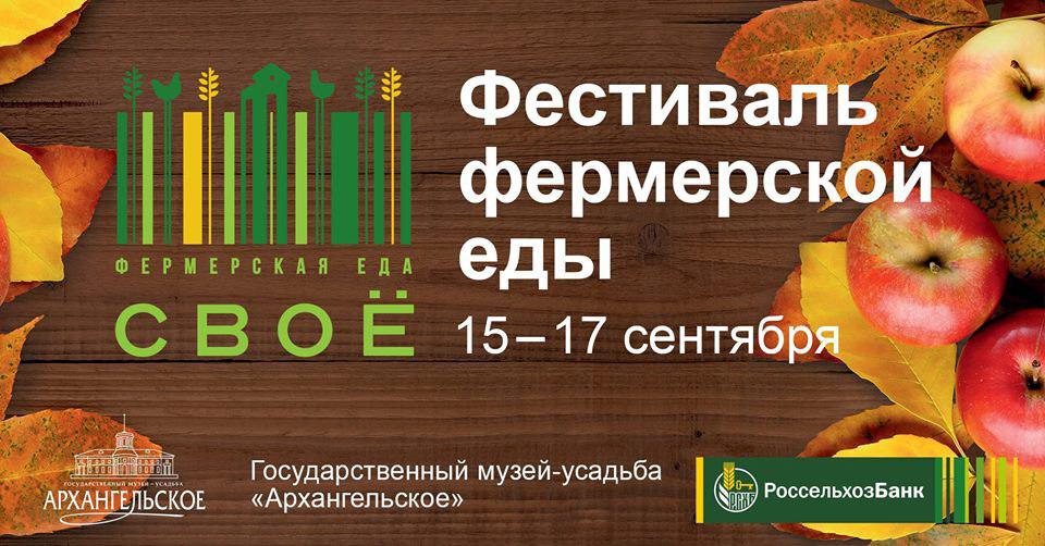 Фестиваль фермерской еды «СВОЁС 15 по 17 сентября в музее-усадьбе «Архангельское» пройдет первый фестиваль фермерской еды «СВОЁ». Фестиваль «СВОЁ» - яркое, праздничное, семейное мероприятие для настоящих любителей русской кухни и российских продуктов. В течение трех дней гости фестиваля смогут познакомиться с лучшими фермерами России, попробовать и оценить их продукцию, выбрать и купить самое вкусное. Но главное – каждый из присутствующих сможет еще раз убедиться, что наша огромная страна самодостаточна и уникальна, её народ талантливый и целеустремленный, для которого «СВОЁ» не пустой звук, а философия жизни.