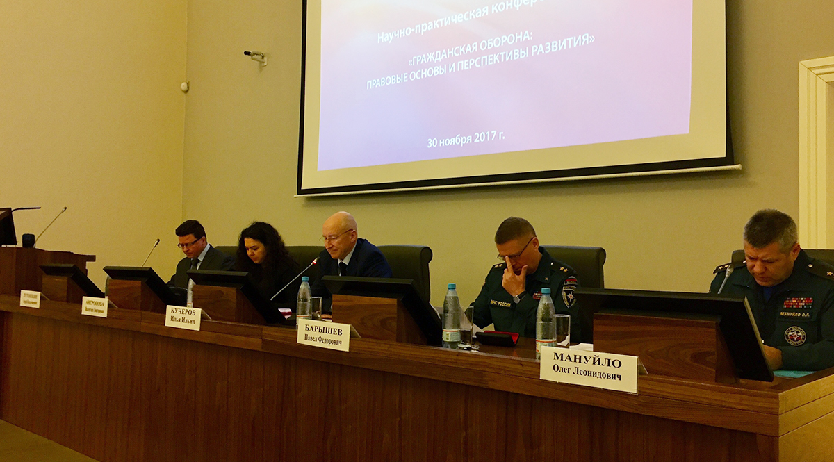 Конференция «Гражданская оборона: правовые основы и перспективы развития»В продолжение исследований нормативно-правовых основ и методического обеспечения реализации государственной политики в области гражданской обороны 30 ноября 2017 года Институт законодательства и сравнительного правоведения при Правительстве Российской Федерации совместно с Министерством Российской Федерации по делам гражданской обороны, чрезвычайным ситуациям и ликвидации последствий стихийных бедствий провел научно-практическую конференцию «Гражданская оборона: правовые основы и перспективы развития». В работе конференции приняли участие представители федеральных органов исполнительной власти (Министерства Российской Федерации по делам гражданской обороны, чрезвычайным ситуациям и ликвидации последствий стихийных бедствий, Министерства финансов Российской Федерации и др.), члены Экспертно-консультативного совета при Совете Парламентской Ассамблеи ОДКБ, представители ведущих научных и учебных организаций (Всероссийского научно- исследовательского института по проблемам гражданской обороны и чрезвычайных ситуаций МЧС России, НИИ Академии гражданской защиты МЧС России, НИИ Академии Генеральной прокуратуры Российской Федерации, Московского государственного университета имени М. В. Ломоносова, Московского университета Министерства внутренних дел Российской Федерации имени В.Я. Кикотя, Санкт-Петербургского университета ГПС МЧС России, ФГБВОУ ВО Академии гражданской защиты МЧС России, ФГБУ ВНИИ ГОЧС (ФЦ) и др.).