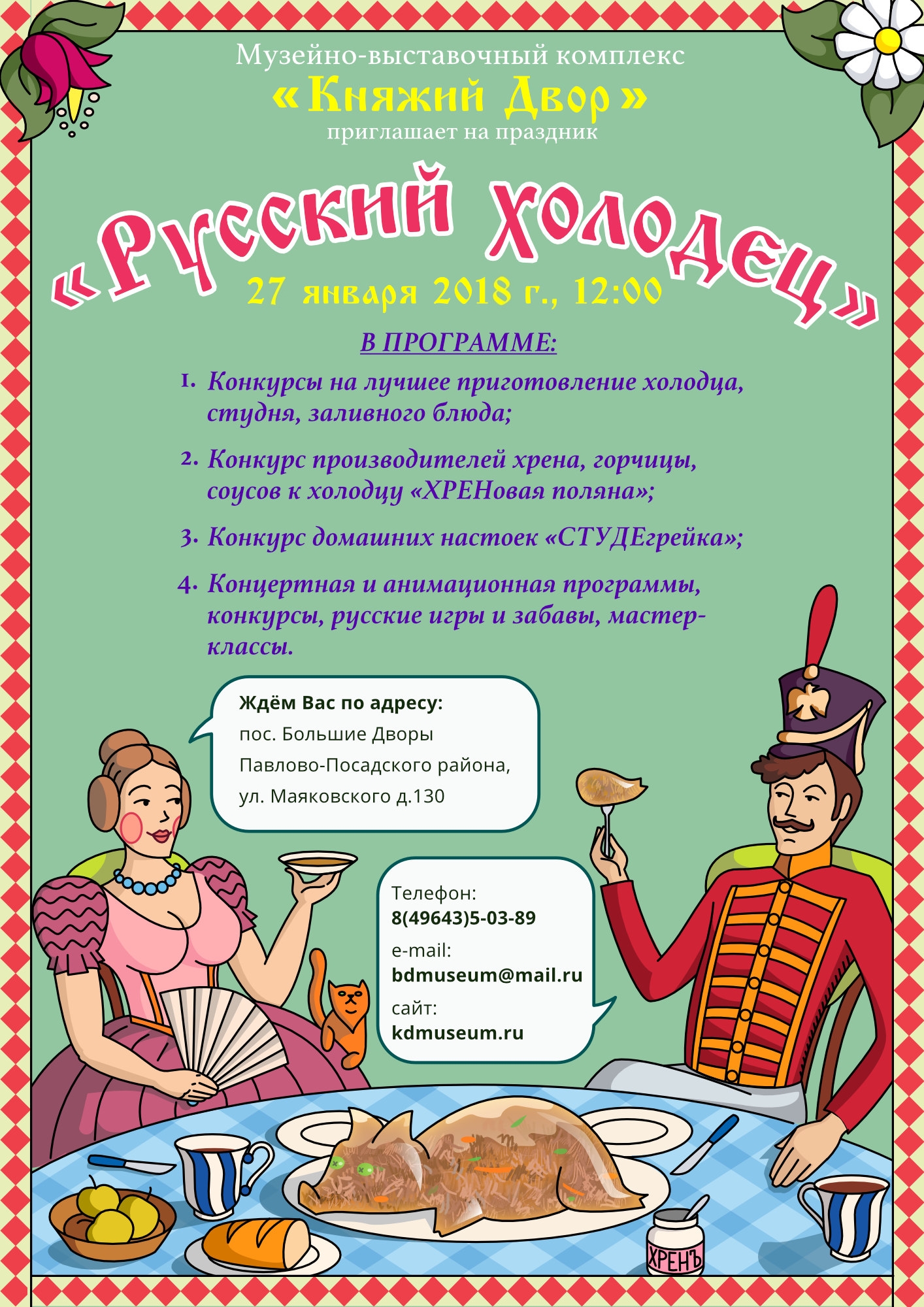 Приглашаем торговые предприятия и организации общественного питания на конкурсную программуАдминистрация городского округа Павловский-Посад приглашает вас принять участие в мероприятии, которое состоится27 января 2018 года с 12.00 до 16.00 на территории музейно-выставочного комплекса «Княжий Двор» (городской округ Павловский Посад, поселок Большие Дворы, ул. Маяковского, д. 130) состоится V юбилейный праздник «Русский холодец». Праздник «Русский холодец» является победителем национальной премии в области событийного туризма «RussianEventAwards» в номинации «Лучший проект в области гастрономического туризма» и Дипломантом IIIстепени в номинации «Площадка для проведения туристического события». В 2016 году праздник стал основой сюжета одного из выпусков «Вечерний Ургант» на первом канале. Приглашаем торговые предприятия, организации общественного питания, учреждения образования и культуры Вашего муниципального образования принять в конкурсной программе праздника. Участниками конкурсной программы праздника «Русский холодец» могут стать все желающие, ознакомившиеся с Положением и направившие заполненную анкету участника организаторам мероприятия. Контактное лицо — Ушакова Ирина Константиновна — директор муниципального учреждения культуры «Музейно-выставочный комплекс «Княжий Двор» (телефон для справок: 8(49643)5-03-89, E-mail: bdmuseum@mail.ru).