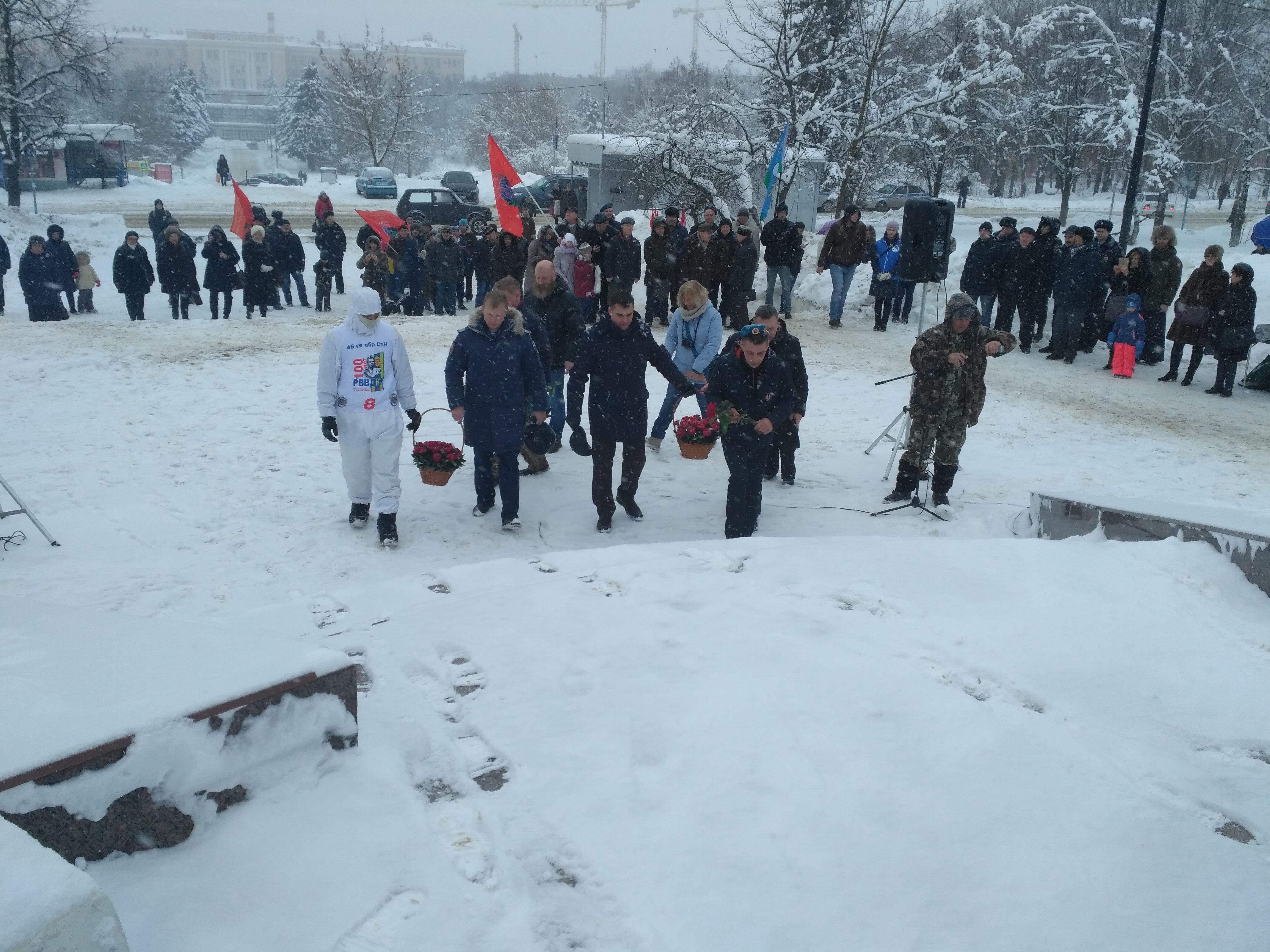 Затем на Площади Победы состоялся митинг в память о лыжном переходе 45-й гвардейской бригады ВДВ РФ и возложение цветов к обелиску.