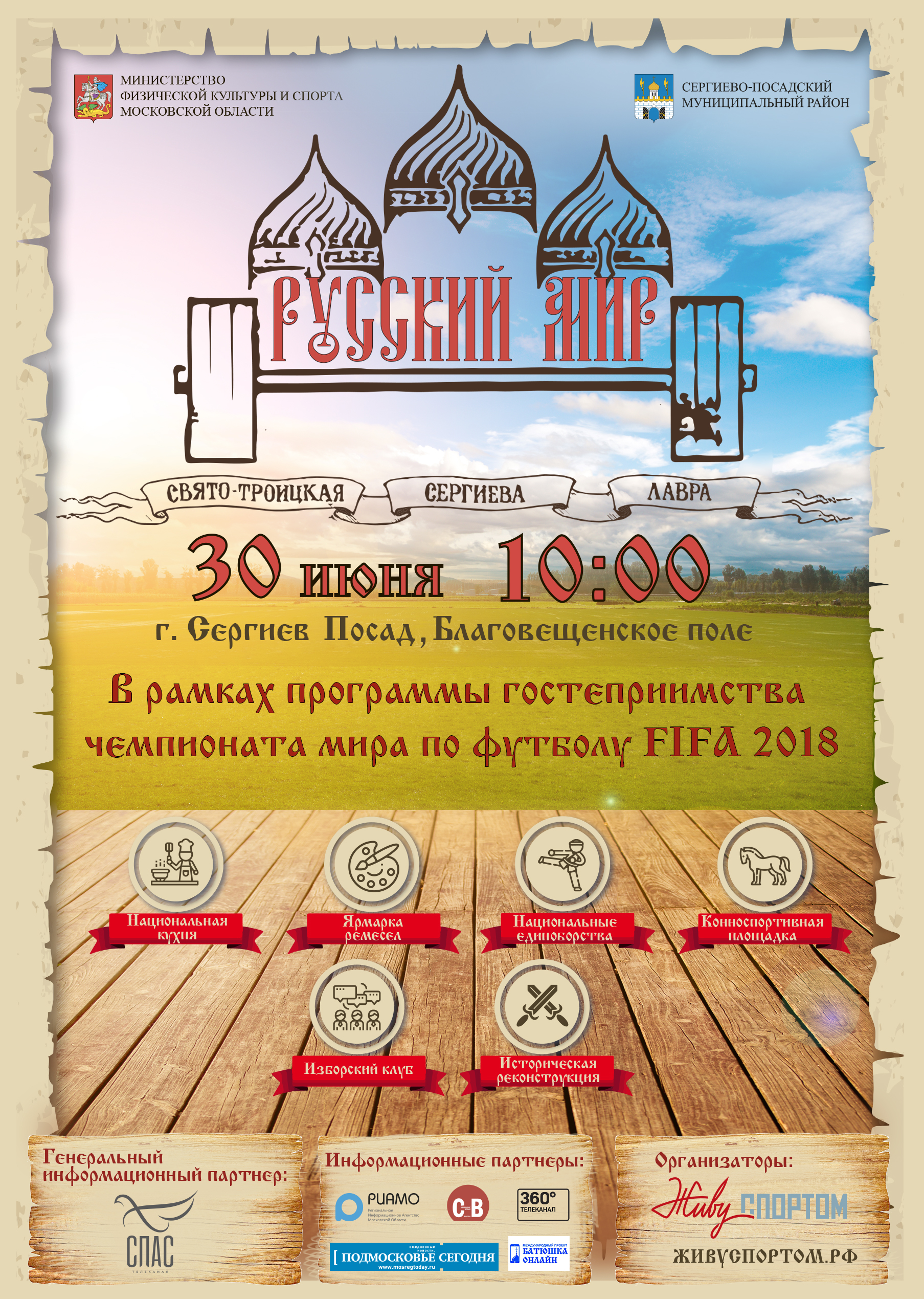 Фестиваль «Русский мир» в Сергиевом Посаде Добраться до места проведения фестиваля можно общественным транспортом - от храма Петра и Павла на ул. 1-й Ударной армии будет ходить автобус. Первый рейс он выполнит в 10 утра. Последний – в 16:00. Конечная остановка - улица Андрея Рублева, оттуда пешком до Благовещенского поля около 10 минут. Второй по счету фестиваль включен в программу гостеприимства чемпионата мира по футболу-2018. Лицами фестиваля в этом году станут Федор Бондарчук и Михаил Пореченков. Председателем попечительского совета фестиваля «Русский мир» является легендарный спортсмен Александр Карелин. В программе фестиваля гостей и участников ждёт ярмарка ремесел, национальная кухня разных народов, спортивные состязания и культурная программа. Все желающие смогут походить на ходулях, покататься на русских качелях и посостязаться во многих других народных играх. В спортивной программе фестиваля на разных площадках пройдут соревнования в исконно русских национальных видах спорта: - Перетягивание каната. Участвуют 32 команды из 8 мужчин старше 18 лет - Городошный спорт. 400 участников определят самого меткого. - Гиревой спорт. 16 кг (или по-русски — пуд) одной рукой. По нескольким национальным видам спорта будут разыграны сертификаты разных номиналов для приобретения недвижимости в микрорайоне «Троицкая Слобода». Изюминкой фестиваля станут матчевые встречи по киле - это русская игра в мяч руками и ногами с приёмами из силовых единоборств. В программу фестиваля также войдёт конкурс по скандинавской ходьбе. Впервые будет представлена русская баня, где все участники смогут ознакомиться с секретами древнерусского искусства. Конноспортивная площадка представит гостям мастерство джигитовки, а также конноспортивную игру кок-бору. Площадка национальных единоборств и боевых искусств проведет показательные выступления, мастер классы, матчевые встречи и турниры по комплексному единоборству, борьбе на поясах, шапочному бою, мас-рестлингу, самбо и другим видам. Мероприятие ждет своих гостей с 10 утра. Торжественное открытие фестиваля состоится в 14 часов.