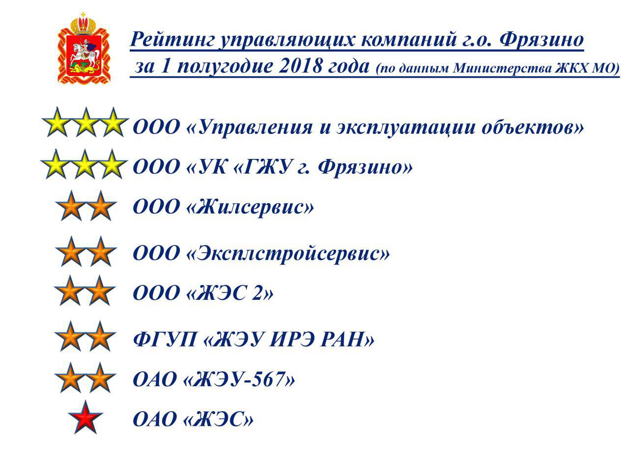 Рейтинг управляющих компаний г.о. Фрязино за первое полугодие 2018 годаПо поручению Губернатора Московской области Андрея Воробьева Министерством ЖКХ Московской области разработан рейтинг управляющих компаний региона за 1 полугодие 2018 года. В Подмосковье работают более 900 таких организаций, в управлении которых находится 46 тыс. многоквартирных домов. Городской округ Фрязино представлен в рейтинге 8 организациями. Предлагаем вашему вниманию рейтинг управляющих компаний г. о. Фрязино за первое полугодие 2018 года.