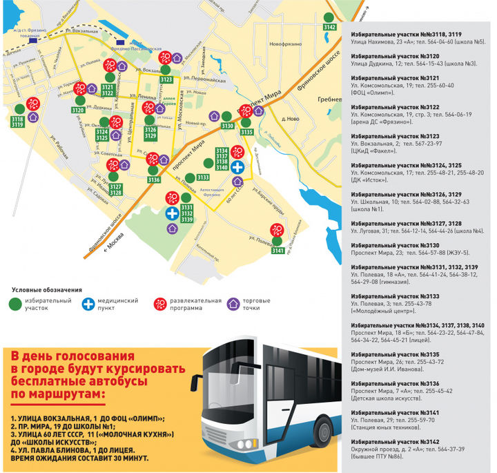 Карта избирательных участков на выборах Губернатора Московской области 9 сентября9 сентября во Фрязино пройдут выборы Губернатора Московской области. Избирательные участки откроются в 8 утра. Проголосовать можно будет до 8 вечера. На всех избирательных участках города местные творческие коллективы представят праздничную концертную программу. Жителей ждут выступления коллективов народной песни, фольклорно-этнографических ансамблей, детских театральных студий.