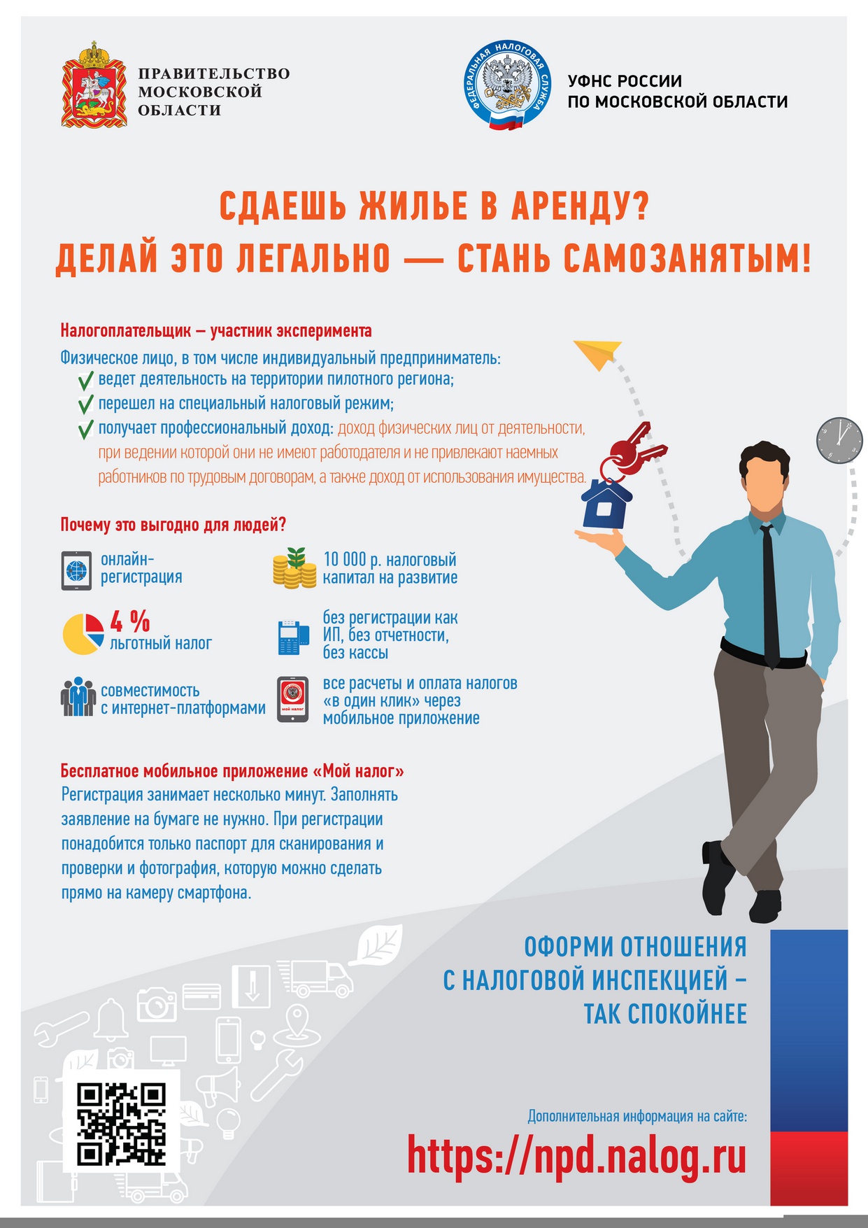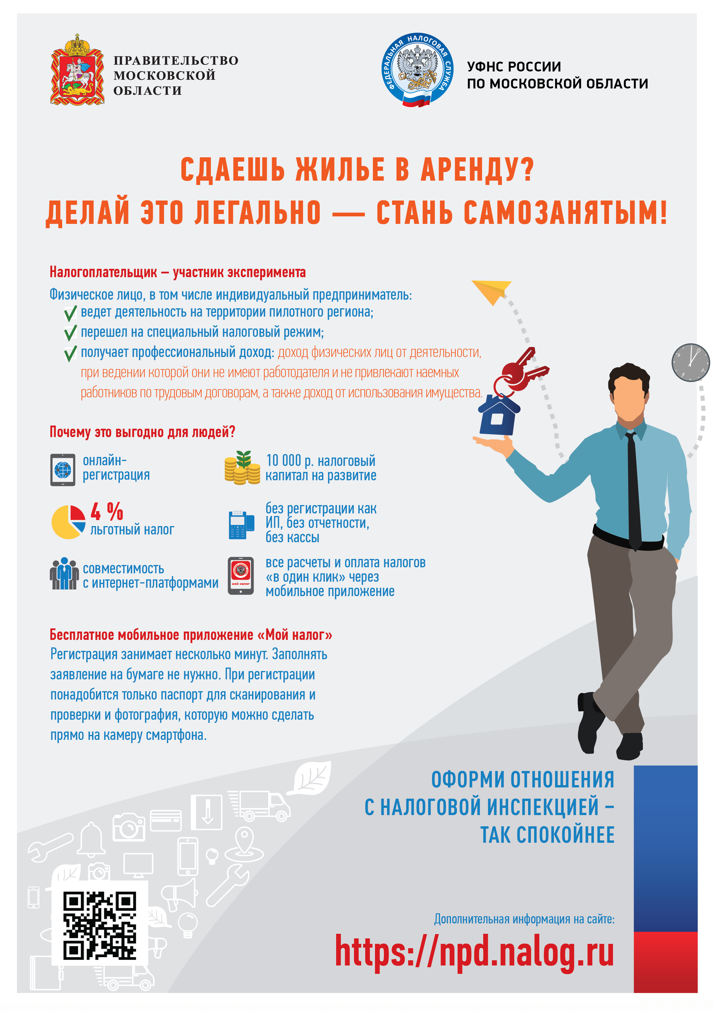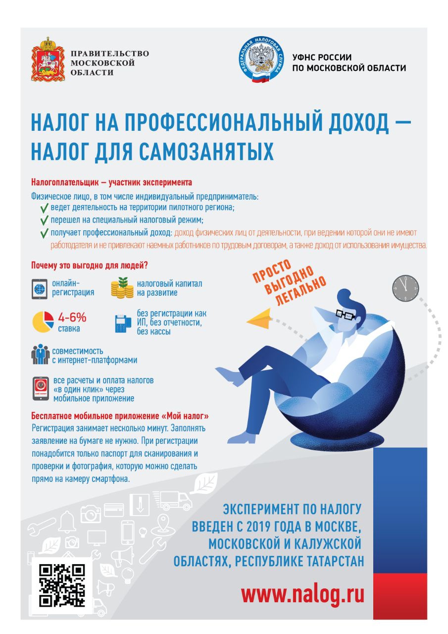 Информационное письмо о налоговом режиме «самозанятых»С 1 января 2019 года в 4х субъектах РФ, в том числе в Московской области, стартовал эксперимент по применению физическими лицами и ИП нового налогового режима «Налог на профессиональный доход» (далее – режим для «самозанятых»). Действовать этот режим будет в течение 10 лет. Налог на профессиональный доход — это не дополнительный налог, Переход на него осуществляется добровольно. Несовершеннолетние граждане в возрасте от 14 до 18 лет также при соблюдении ряда условий вправе перейти на новый налоговый режим. При этом сфера деятельности «самозанятых» не ограничена, в связи с чем они могут получать дополнительные доходы как репетиторы, кондитеры, маркетологи, люди иных профессий в различных сферах жизни. У тех налогоплательщиков, которые не перейдут на этот налоговый режим, остается обязанность платить налоги с учетом других систем налогообложения, которые они применяют в обычном порядке, чтобы избежать ответственности за незаконную предпринимательскую деятельность. Особенности режима «самозанятых» 1. Пониженная ставка налога. Вместо 13% НДФЛ и 6% от деятельности индивидуальный предприниматель (далее – ИП) «самозанятые» уплачивают: 4% налога, если доход получен от физического лица, 6%, если от ИП и юридического лица. Совмещать иные специальные налоговые режимы нельзя, даже по разным видам деятельности. 2. Простота регистрации и использования. Регистрация осуществляется без посещения налоговых органов через мобильное приложение «Мой налог». Дальнейшее применение режима не требует представления отчетов и декларации в налоговые органы. Все действия можно сделать через приложение «Мой налог», расчёты будут осуществлять также через приложение (способ оплаты в отделениях банка тоже возможен). Учет доходов ведется автоматически в мобильном приложении. Не надо покупать ККТ. Чек можно сформировать в мобильном приложении «Мой налог» или в личном кабинете плательщика налога на профессиональный доход. Чек может быть передан покупателю (заказчику) в электронной форме или на бумажном носителе. В отношении передачи чека в электронной форме предусмотрены следующие возможные способы ее осуществления: 1) путем направления чека покупателю (заказчику) на мобильный телефон или адрес электронной почты, представленные покупателем (заказчиком); 2) путем обеспечения покупателю (заказчику) возможности в момент формирования чека в месте продажи считать компьютерным устройством (мобильным телефоном, смартфоном или компьютером, включая планшетный компьютер) QR-код, содержащийся на чеке. Налог начисляется автоматически в приложении после каждой оплаты услуг/работ. Уплата налога осуществляется не позднее 25 числа следующего месяца, можно настроить автоплатеж в мобильных приложениях банков. 3. Официальное подтверждения дохода. Ограничена сумма получаемого дохода – не более 2,4 млн. в год. При этом сумма доходов от работодателя по трудовому договору Доход подтверждается официальным документом - справкой (можно распечатать через приложение), которая представляется в кредитные и иные организации. Официальный статус дает возможность обращаться в суд за защитой своих прав и интересов. При этом нет обязанности уплачивать фиксированные взносы на пенсионное и медицинское страхование. Однако период 