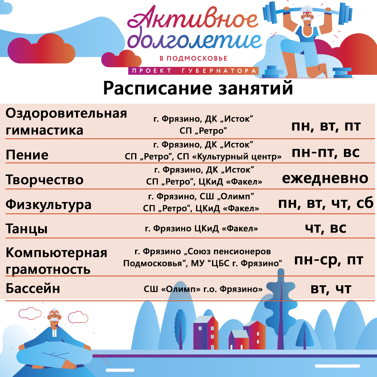 В рамках Губернаторской программы АктивноеДолголетие во Фрязино ежедневно проходят бесплатные занятия для старшего поколения«Активное долголетие» создано для поддержания активного образа жизни людей старшего поколения, улучшения их психоэмоционального состояния, укрепления здоровья. А главное все занятия в рамках программы «Активное долголетие» проводятся бесплатно. Проект действует в Подмосковье с 10 июня 2019 года. «Активное долголетие» — это кружки, секции, спортивные занятия и туристические поездки, бассейн и компьютерные курсы, и многое другое. Присоединиться к программе могут женщины от 55 и мужчины от 60 лет. В Фрязино проходят такие бесплатные занятия как: Оздоровительная гимнастика, пение, танцы, бассейн, физкультура, творчество, компьютерная грамотность. Оздоровительная гимнастика: 1). МУЧ "ДК Исток" г. Фрязино (ул. Комсомольская, д. 17) - Каждый вт и пт 11:00 до 12:00; 2). Структурное подразделение «Ретро» (ул. Полевая, д.6) - Занятия в кружке «Женская гимнастика» каждый пн и пт с 10:00 до 13:00; 3). Структурное подразделение «Ретро» (ул. Полевая, д.6) - Занятия в кружке «Фитнес 60+» каждый пн и пт с 13:30 до 16:00; Пение: 1). МУЧ "ДК Исток" г. Фрязино (ул. Комсомольская, д. 17) - Занятия в «Народном» коллективе «Играй, гармонь» (вокальная группа) каждую среду с 19:00 до 21:00; 2). МУЧ "ДК Исток" г. Фрязино (ул. Комсомольская, д. 17) - Занятия в «Народном» коллективе «Русский хор» каждую пн и чт с 18:00 до 21:00; 3). МУ «ЦКиД «Факел» г. Фрязино (ул. Вокзальная, д. 2) - Занятия в «Народном» хоре ветеранов «Хор русской песни «Узоры Московии» каждый вт, чт и вс с 17:45 до 22:00; 4). Структурное подразделение «Ретро» (ул. Полевая, д.6) - Занятия в хоре русской песни «Напевы России» каждый вт и чт с 10:00 до 13:00 и в пт с 18:00 до 21:00; 5). Структурное подразделение «Ретро» (ул. Полевая, д.6) - Занятия в любительском объединении «С песней по жизни» каждый вт с 11:00 до 13:00; 6). Структурное подразделение «Культурный центр» (ул. Комсомольская, д.28) - Занятия в кружке «Споемте, друзья» в ноябре: 12, 17, 24, 26 с 14:00 до 17:00; в декабре: 1, 3, 8, 15, 17, 20 с 14:00 до 17:00. Творчество: 1). МУЧ "ДК Исток" г. Фрязино (ул. Комсомольская, д. 17) - Занятия в Театр-студии ТСМ каждый день с пн-пт с 19:00 до 21:00; 2). МУЧ "ДК Исток" г. Фрязино (ул. Комсомольская, д. 17) - Занятия в «Народном» коллективе «Играй, гармонь» (инструментальная группа) каждую сб с 10:00 до 15:00; 3). МУЧ "ДК Исток" г. Фрязино (ул. Комсомольская, д. 17) - Занятия в театральной студии «Здравствуй, папа» каждый чт и вс с 19:00 до 21:00; 4). МУ «ЦКиД «Факел» г. Фрязино (ул. Вокзальная, д. 2) - Занятия в литературно-музыкальном кружке «Лира» каждый вт и чт с 16:00 до 21:00; 5). МУ «ЦКиД «Факел» г. Фрязино (ул. Вокзальная, д. 2) - Занятия в кружке «Краски жизни» каждую ср с 18:00 до 20:30 и сб с 10:00 до 12:30; 6). Структурное подразделение «Ретро» (ул. Полевая, д.6) - Занятия в любительском объединении «Жить здорово!» каждый пн с 14:00 до 16:00; 7). Структурное подразделение «Ретро» (ул. Полевая, д.6) - Занятия в кружке «Волшебный лоскуток» каждый пн с 18:00 до 20:15; 8). Структурное подразделение «Ретро» (ул. Полевая, д.6) - Занятия в кружке «Прикладное творчество» каждый вт и ср с 14:00 до 17: 00 и чт 17.00-20.00; 9). Структурное подразделение «Ретро» (ул. Полевая, д.6) - Занятия в кружке «Мастерская чудес» каждый вт и пт с 11:30 до 13:45. Физкультура: 1). МУ «ЦКиД «Факел» г. Фрязино (ул. Вокзальная, д. 2) - Занятия в кружке «Гимнастика для взрослых» каждый пн и чт с 9:00 до 11:15; 2). Структурное подразделение «Рет