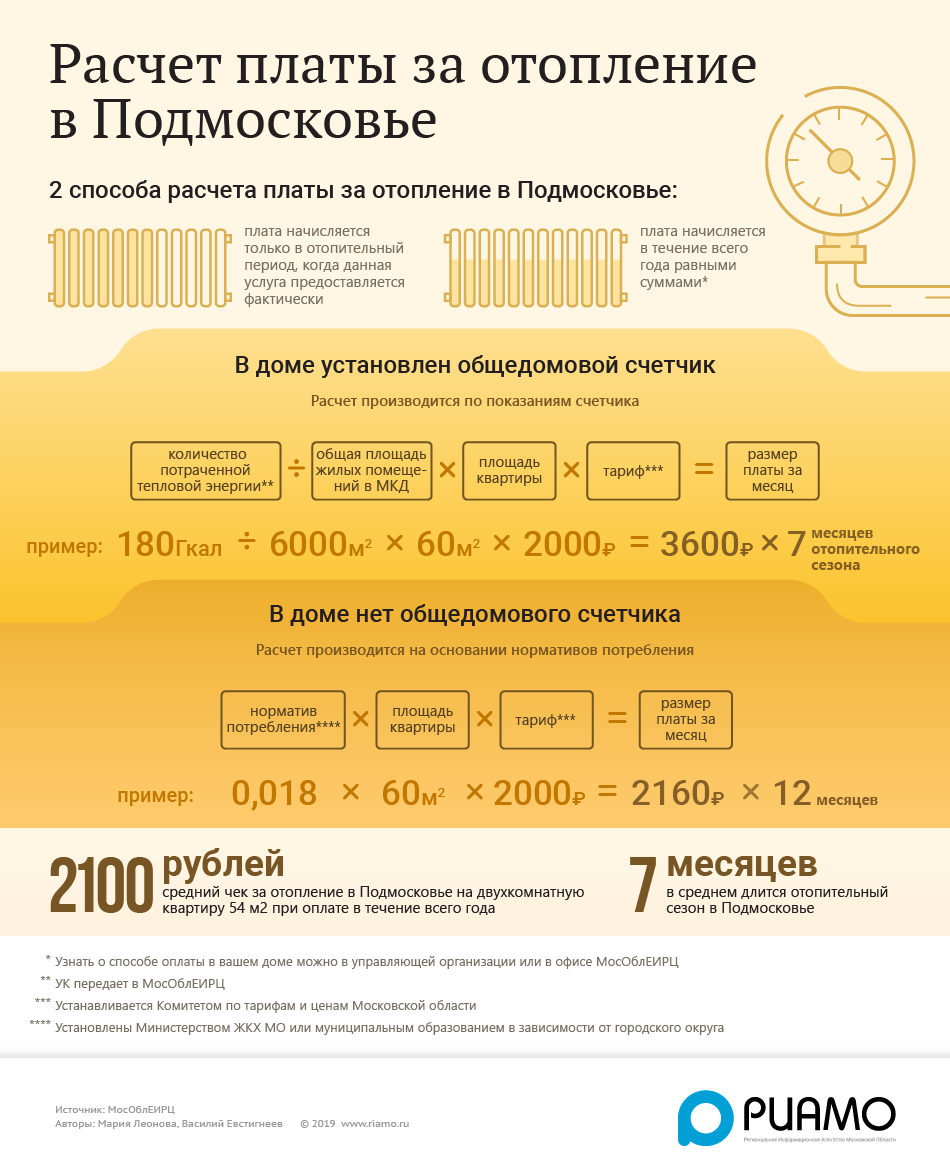 Способы расчета платы за отопление в ПодмосковьеРасчет платы за отопление в Подмосковье зависит от того, установлен в многоквартирном доме общедомовый счетчик или нет. В первом случае плата за тепло взимается только в отопительный сезон, во втором – на протяжении всего года. Если в доме есть счетчик, расчет производится исходя из количества потраченного тепла, общей площади дома, площади квартиры и тарифа, установленного Комитетом по тарифам и ценам Московской области. Если счетчика нет, то учитывается норматив потребления тепла, площадь квартиры и тариф. |