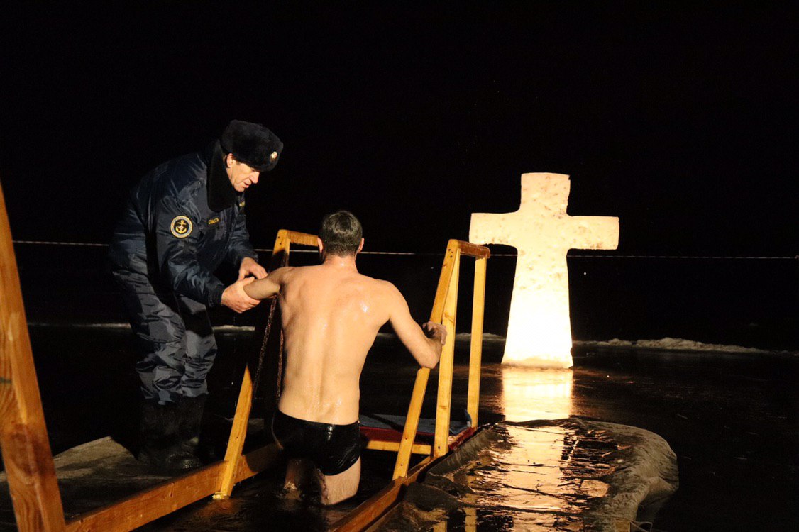 «Крещенские купания» на озере «Большое» 2020 года.Вечером и в ночь на Богоявление существует традиция купаний в прорубях-иорданях, куда верующие троекратно погружаются с молитвой. На озере "Большое" (ул.Озерная) в прибрежной зоне водно-спасательного поста была установлена купель, были смонтированы стационарные деревянные настилы вокруг проруби с ограждениями и поручнями. Особенность купели в том, что прихожане здесь не имели прямого выхода на лед, а опускались в воду с деревянного помоста. По данным водно-спасательного поста в праздник «Крещение Господне» купель на озере «Большое» посетило более 1000 человек. Около купели были организованы дежурства спасателей водно-спасательного поста, сотрудников МКУ «ЕДДС г. Фрязино».