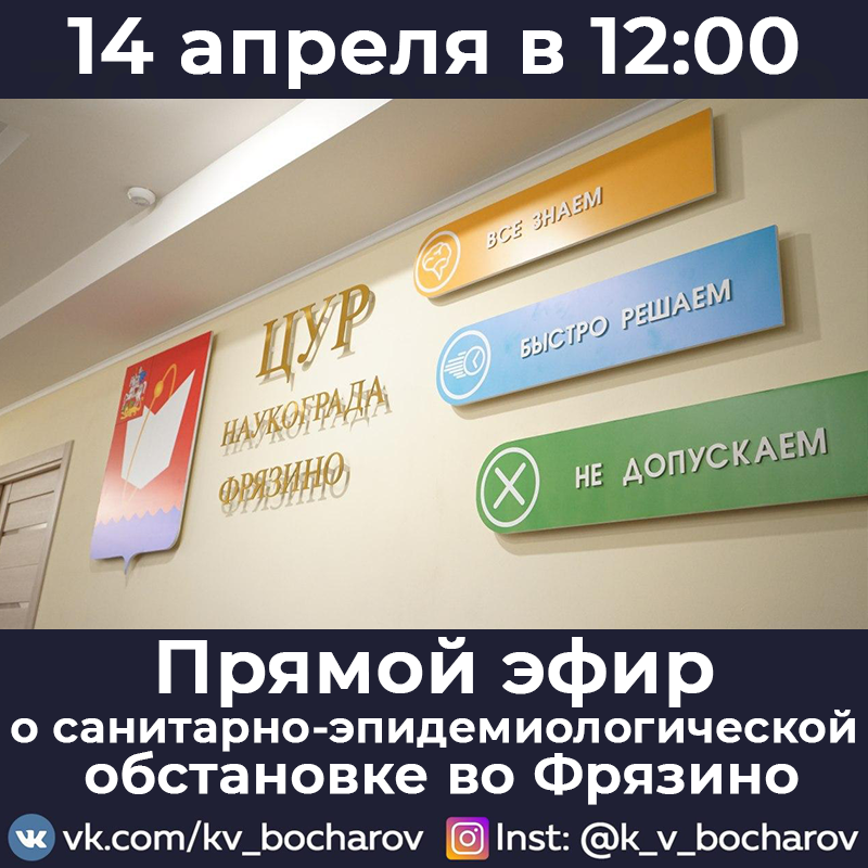 Во вторник, 14 апреля в 12:00, состоится очередной прямой эфир с главой городского округа Фрязино Константином Бочаровым. В прямом эфире Вас проинформируют о санитарно-эпидемиологической обстановке. Эфир будет доступен в аккаунте Главы в Instagram и на странице ВКонтакте: |
