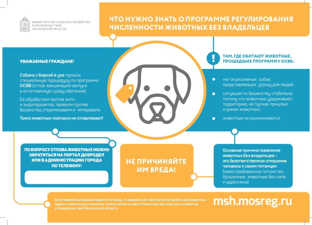 Министерство сельского хозяйства и продовольствия Московской области регулирует численность животных без владельцев гуманным способомБездомных животных отлавливают, стерилизуют, чипируют, прививают против бешенства и выпускают.Обращаем внимание, что работа с животными без владельцев регламентирована законом, а именно — ч.2 ст.3 Федерального закона от 27.12.2018 №498-ФЗ. На основании этого органы местного самоуправления производят: отлов животных без владельцев, их содержание (в том числе лечение, вакцинацию, стерилизацию), возврат на прежние места их обитания. В связи с чем, обращаем ваше внимание на то, что, если вы видите собаку с биркой в ухе это означает, что с ней проведены необходимые процедуры.