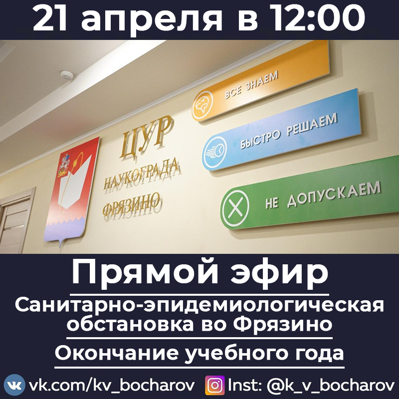 21 апреля в 12:00, состоится очередной прямой эфир с главой городского округа Фрязино Константином Бочаровым. На этот раз тема санитарно-эпидемиологической ситуации в городе дополнится темами образования: дистанционное обучение, конец учебного года, итоговая аттестация. Эфир будет доступен в аккаунте Главы в Instagram и на странице ВКонтакте: |